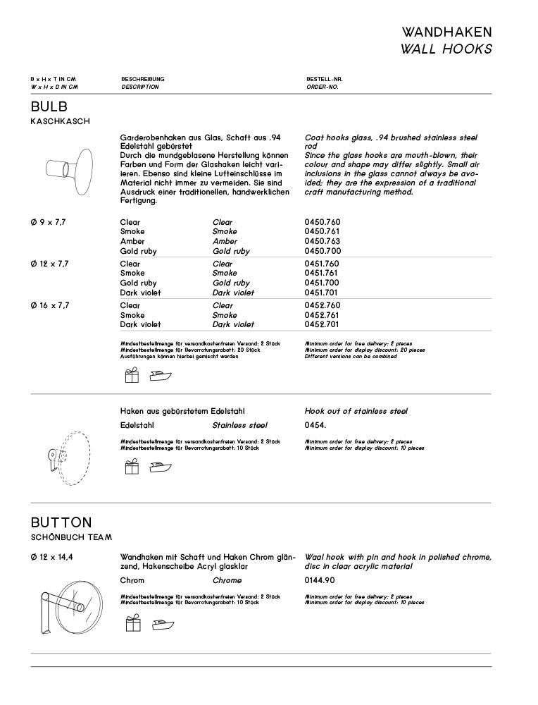Die Schönbuch Bulb Garderobenhaken, von Kaschkasch designt, bilden mit ihrem transparenten Look eine moderne Aufhängungslösung für Mäntel, Jacken oder Taschen. Die Bulb Haken werden aus mundgeblasenem Glas gefertigt und mithilfe eines Metallschafts aus gebürstetem Edelstahl an der Wand befestigt. Aufgrund der speziellen Fertigungsweise sind Lufteinschlüsse im Glas nicht immer vermeidbar, was den Schönbuch Glashaken ein noch individuelleres Erscheinungsbild verleiht.