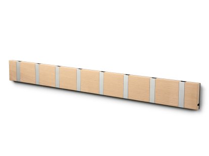 Die Knax Garderobe von dem dänischen Hersteller LoCa wurde von Harrit & Sørensen A/S designt und besticht durch ihr schlichtes und gleichzeitig elegantes Design. Die Haken aus Aluminium lassen sich ausklappen und verschwinden bei Nichtgebrauch wieder in der Holzleiste.