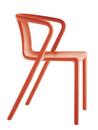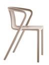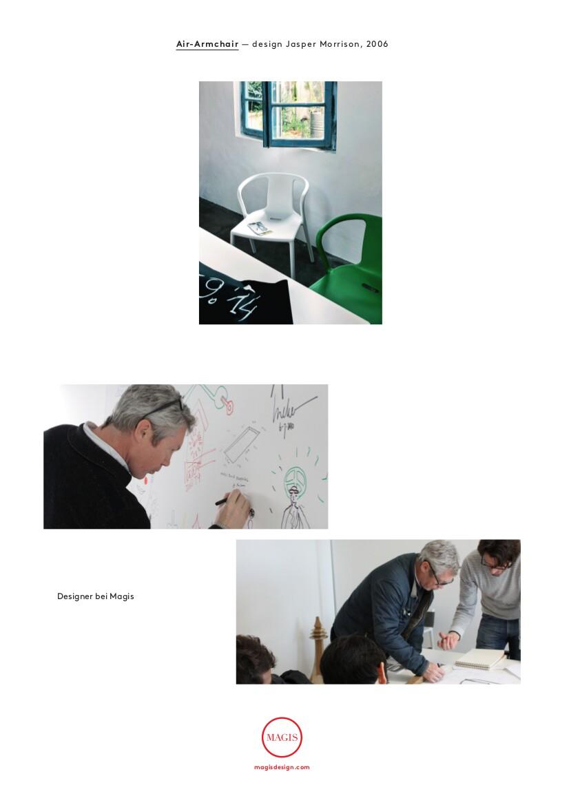 Der im Jahr 1959 in London geborene Designer Jasper Morrison entwarf den Air-Armchair als Nachfolger des Air-Chair, der seit dem Jahr 2000 von dem italienischen Möbelhersteller Magis produziert wird. Ganz im Sinne der "Neuen Einfachheit", die Morrison maßgeblich prägte, überzeugt der Stuhl durch sein reduziertes, klares Design. Als Weiterentwicklung des Magis Air-Chair verfügt der Air-Armchair über Armlehnen, die direkt in die Stuhlbeine übergehen und mit ihnen optisch verschmelzen. Die ergonomisch gestaltete Sitzfläche bietet einen hohen Sitzkomfort. Genau wie sein Vorgänger ist der Magis Air-Armchair aus mit Glasfaser verstärktem Polypropylen gefertigt. Kunststoff gilt nicht nur als äußerst wandelbar und universell einsetzbar sondern ermöglicht aufgrund seiner Robustheit auch die Nutzung der Möbel im Innen- und Außenbereich. Der italienische Möbelhersteller Magis legt seinen Fokus auf die Entwicklung von Kunststoffstühlen und Kombinationskonzepten von Tischen und Stühlen,arbeitet seit einiger Zeit allerdings auch mit anderen Materialien wie Holz oder Aluminium.