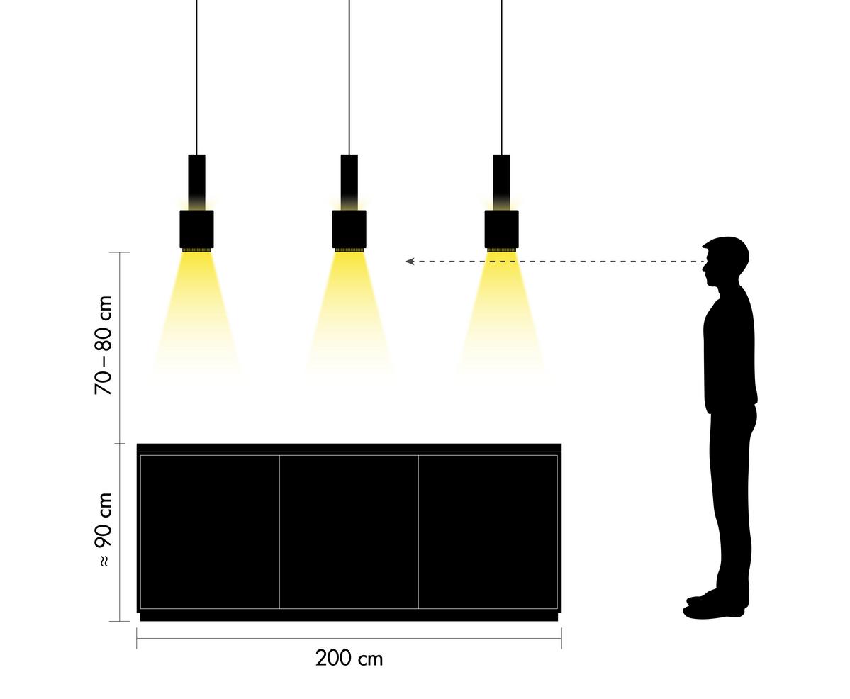 Je nach Aufteilung eignen sich in der Küche mittig platzierte Hängeleuchten oder Deckenleuchten und/oder zusätzliche Lichtquellen über der Arbeitsplatte. Idealerweise sollte der Abstand zwischen Arbeitsfläche und Hängeleuchte und je nach Körpergröße des Nutzers bzw. der Nutzerin ca. 70-80 cm betragen, damit diese/r nicht geblendet wird.