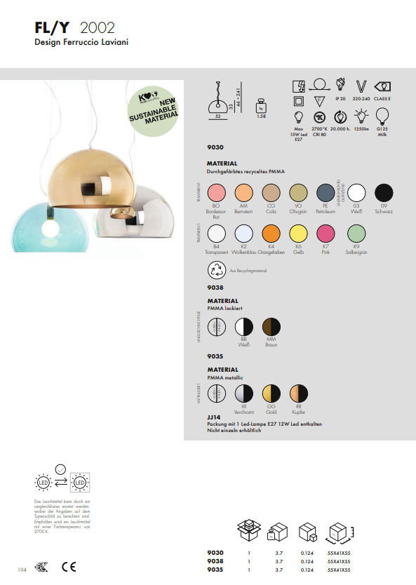 | Ausführungen | Alternativ sind die kleinere Leuchte Small FL/Y, die Leuchte FL/Y Metallic oder die größere Leuchte BIG FL/Y erhältlich. |