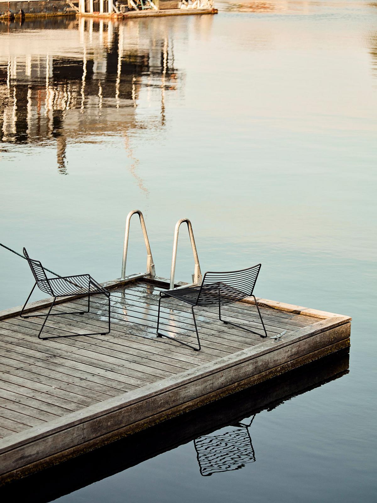 Zur Hee Kollektion gehören ein Loungesessel, ein Esszimmerstuhl und ein Barhocker. Die filigrane Struktur der schlichten Hee Sitzmöbel wird von Hay aus verzinktem Stahl realisiert und in einer erlesenen Auswahl gedeckter Farbtöne pulverbeschichtet. Ob also beim Entspannen auf der Terrasse, als Barmöbel am Tresen, oder als Bestuhlung für Restaurants und Freisitze, die Stühle der Hee Kollektion sind vielfältig einsetzbar und lassen sich Dank geringem Gewicht problemlos platzsparend stapeln. Dabei brillieren die Hee Sitzmöbel mit minimalistischem Design und robuster Verarbeitung.
