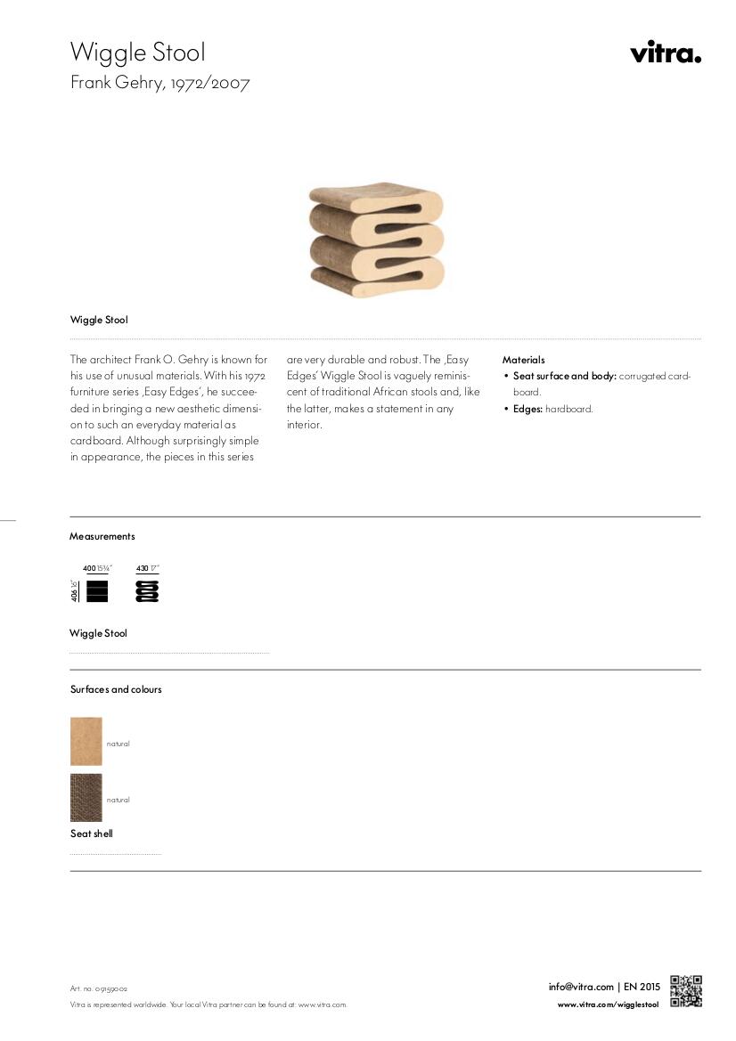 Der Wiggle Hocker, der von Frank Gehry designt wurde und von Vitra vertrieben wird, gehört zu der Serie „Easy Edges“ aus den frühen 70er Jahren, die Gehrys Vorliebe für außergewöhnliche Materialien beweist. Der kleine Hocker, der den Wiggle Stuhl perfekt ergänzt, besticht vor allem durch sein Material: Hier hat Frank Gehry nämlich viele Lagen Karton übereinandergelegt und schließlich in eine charakteristische Form geschnitten. Durch die geschwungene Gestalt und die materialspezifischen Eigenschaften wird der Wiggle Hockerungeahnt stabil und robust und kreiert gleichzeitig einen Blickfang, bei dem man zweimal hinschauen will, um seine Struktur ganz zu verstehen. Die Zusammenarbeit des Designers mit dem Hersteller Vitra ist eine besonders innige, was sich auch daran zeigt, dass der Unternehmenshauptsitz und das Vitra Design Museum von Frank Gehry entworfen wurden.