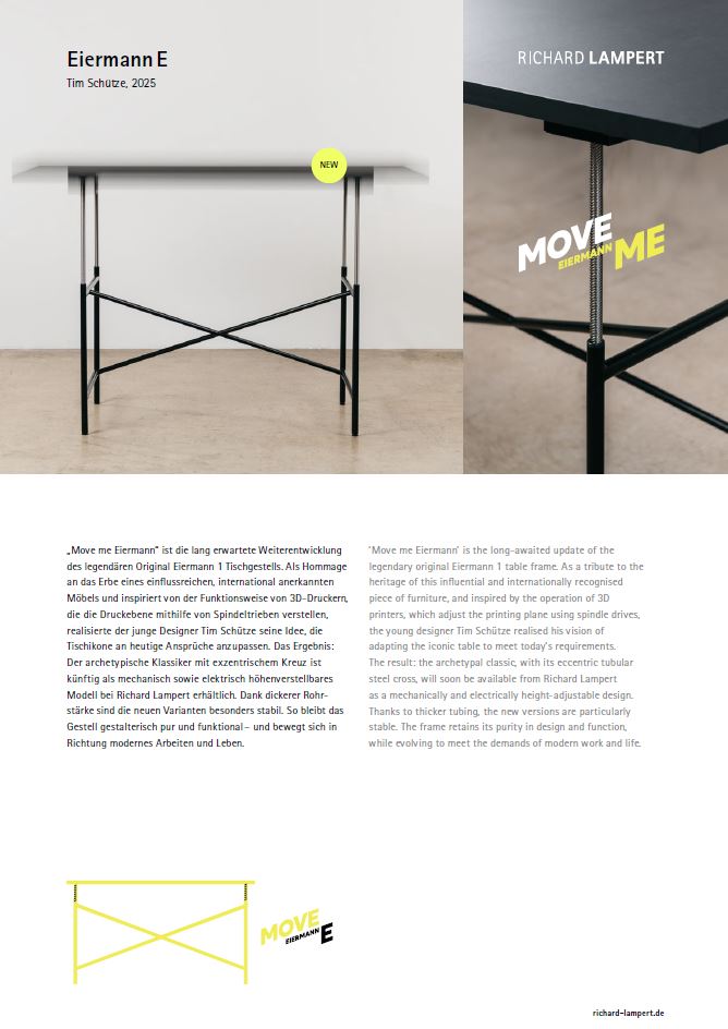 Mit dem elektrisch höhenverstellbaren Eiermann Tisch E präsentiert Richard Lampert nun die rückenschonende Weiterentwicklung der Schreibtisch-Ikone - unabhängig von der Körpergröße. Die von Tim Schütze entwickelte Hommage des Designklassikers ist künftig als elektrisch (Eiermann E) höhenverstellbare Ausführung erhältlich und passt sich somit hervorragend an die zeitgemäßen Ansprüche eines Arbeitstisches an Ergonomie und flexibles, stufenloses Steh-und-Sitz-Arbeiten an, ohne dabei auf das ursprüngliche Design zu verzichten. Der Eiermann 1 Tisch E ist wahlweise mit und ohne Kabelkanal verfügbar. Er lässt sich in wenigen Sekunden per Knopfdruck und Motor auf- und abfahren und eignet sich für besonders häufige Wechsel zwischen Sitz- und Stehposition.