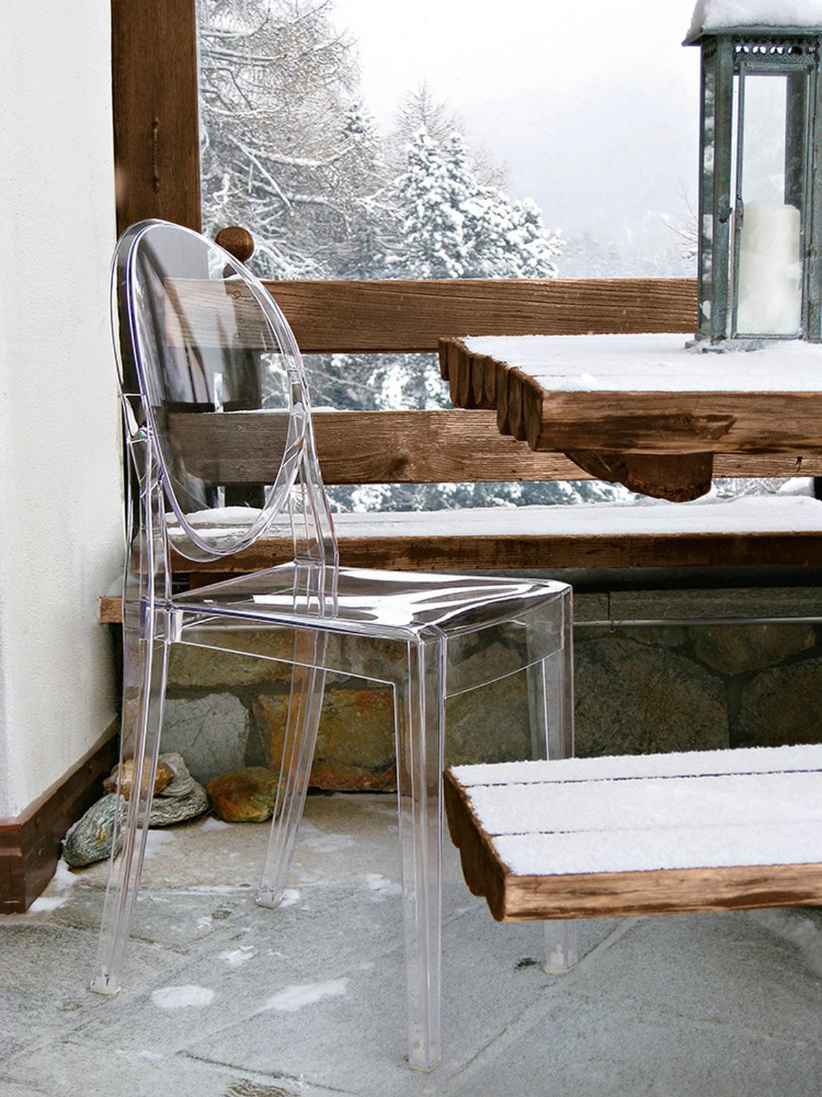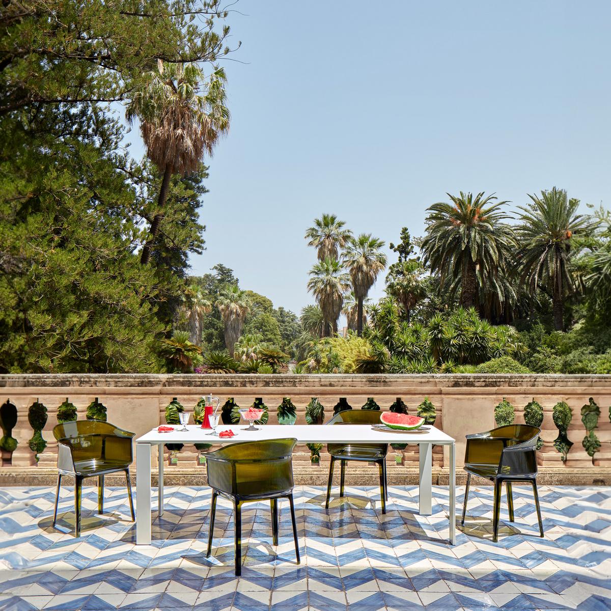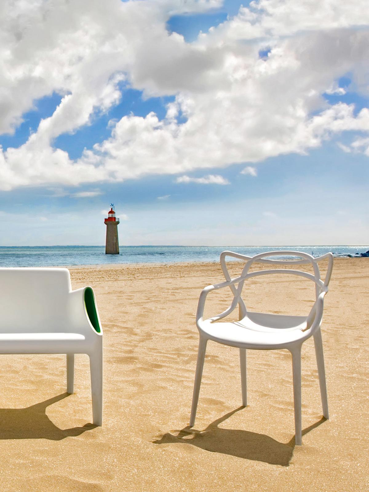 Zur Kartell Metallic Kollektion gehört auch der Kartell Masters Chair, einer von zahlreichen Kartell Stühlen, die aufgrund des Materials Kunststoff drinnen wie draußen eingesetzt werden können und deshalb auch als Gartenstuhl funktionieren.