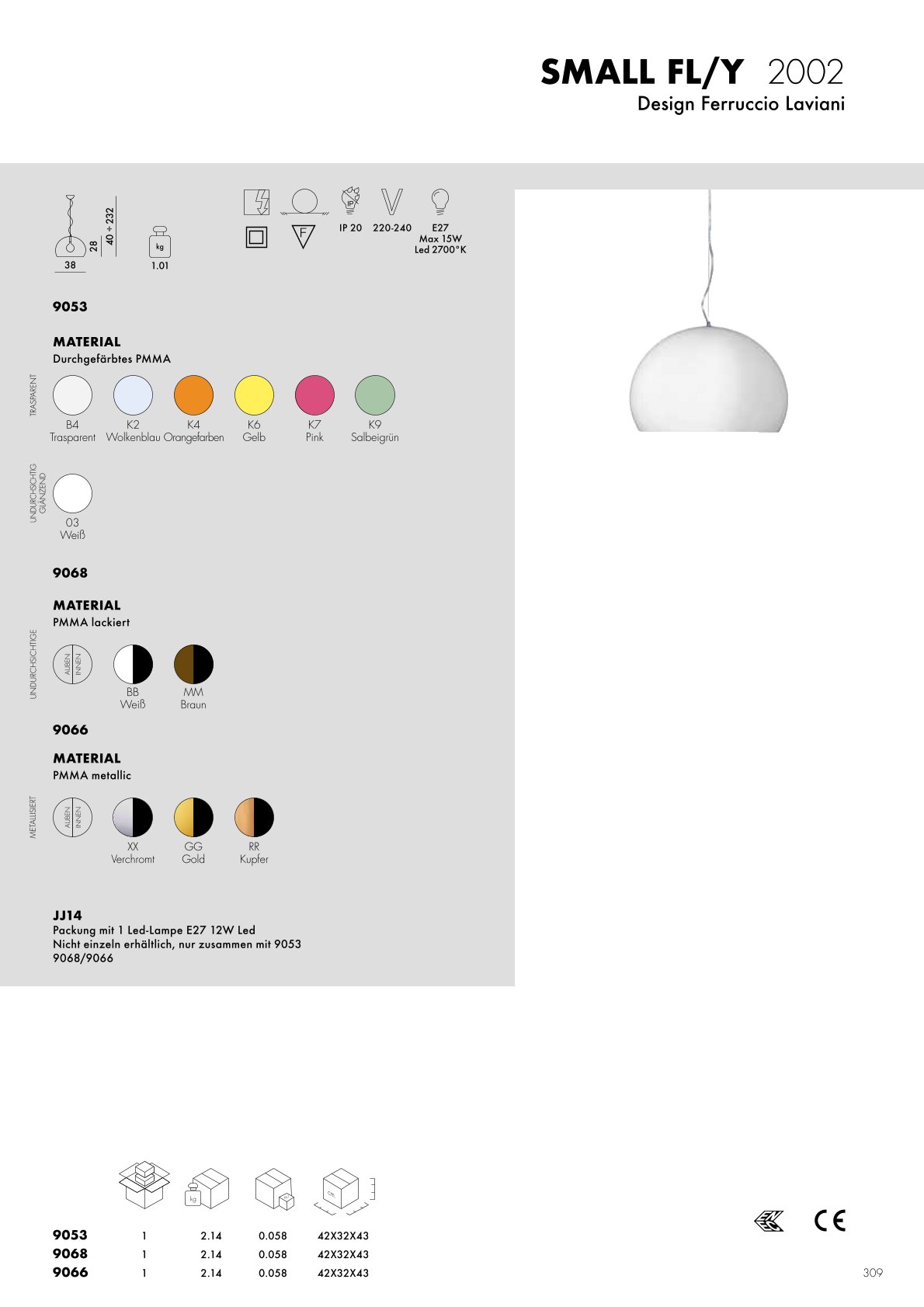 | Ausführungen | In transparenter oder undurchsichtiger Ausführung erhältlich. Die größeren Leuchten FL/Y, FL/Y Metallic und Big FL/Y sind separat erhältlich. |