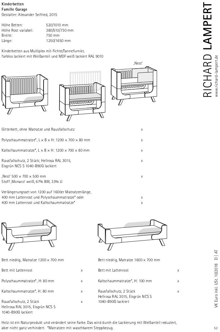 | Material & Farben | Bett: Multiplex aus Birke/Tannefurnier, farblos lackiert mit Weißanteil oder Melaminfolie, weiß Lattenrost: Multiplex Birke mit Gurtbandverbindung Matratze: Kaltschaum |