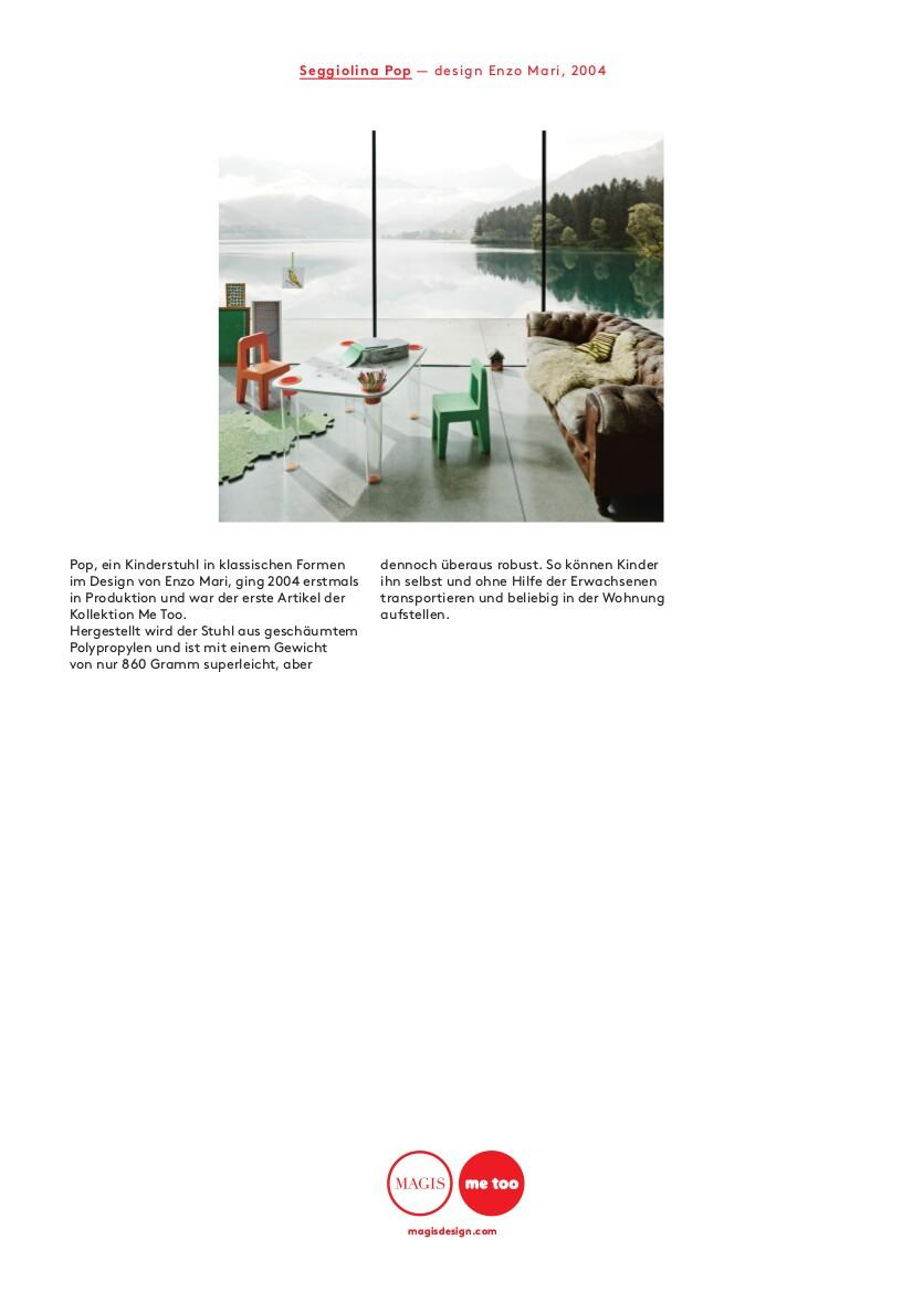 Der Kinderstuhl Seggiolina Pop gehört zur Kollektion Me too von Magis, einer Serie, die speziell für Kinder designt wurde und für leuchtende Kinderaugen sorgt. Gemeinsam mit Enzo Mari, der den Seggiolina Pop entworfen hat, sowie vielen anderen namhaften Designern entwickelte der italienische Hersteller Magis verschiedene originelle Möbel und Spielzeuge, die ein Blickfang in jedem Kinderzimmer sind. Der Kinderstuhl ist aufgrund seines speziellen Materials leicht und dennoch robust, was für Kindermöbel entscheidende Kriterien sind. So kann der Seggiolina Pop Stuhl bequem von einem Raum in den anderen getragen werden und ermöglicht flexibles Spielen und Basteln. Die fantasievollen Objekte der Me too Kollektion des italienischen Herstellers Magis sorgen bei Jung und Alt für Begeisterung.