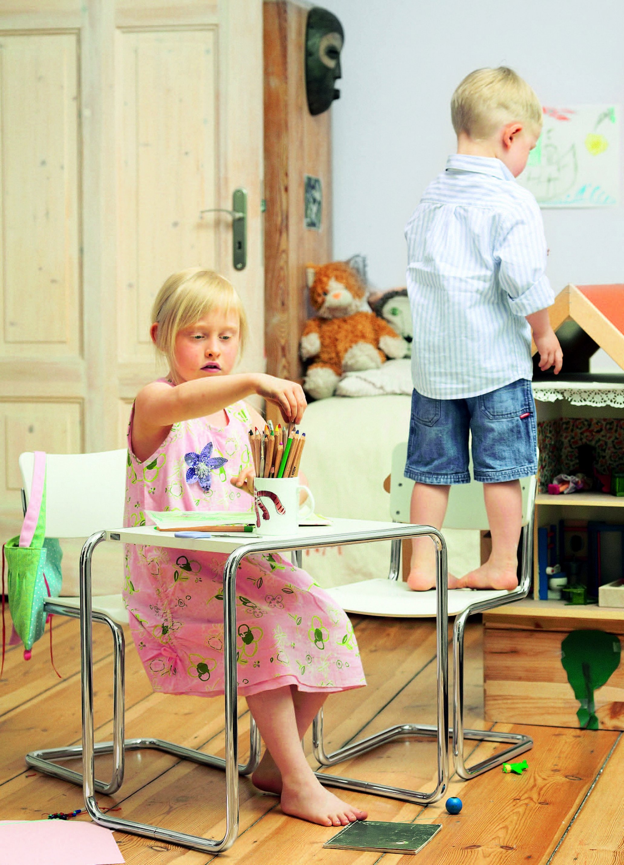 Zahlreiche renommierte Möbelhersteller haben inzwischen kleinere Versionen ihrer ikonischen Entwürfe im Programm, die speziell auf die Bedürfnisse von Kindern zugeschnitten sind – sowohl in ihren Proportionen als auch in ihrer Funktionalität. So etwa der Panton Junior von Vitra, der Serie 7 Kinderstuhl 3177 von Fritz Hansen oder der S 43 K von Thonet: Sie stehen ihren großen Vorbildern in puncto Qualität und Design in nichts nach, sind aber optimal auf kindliche Maße abgestimmt. Auch beim Kinderschreibtisch Eiermann wurde mit Verlängerungsstäben eine clevere Lösung gefunden, die das Möbelstück um 17 cm höhenverstellbar und damit vom Vorschulalter bis ins Jugendzimmer nutzbar macht.