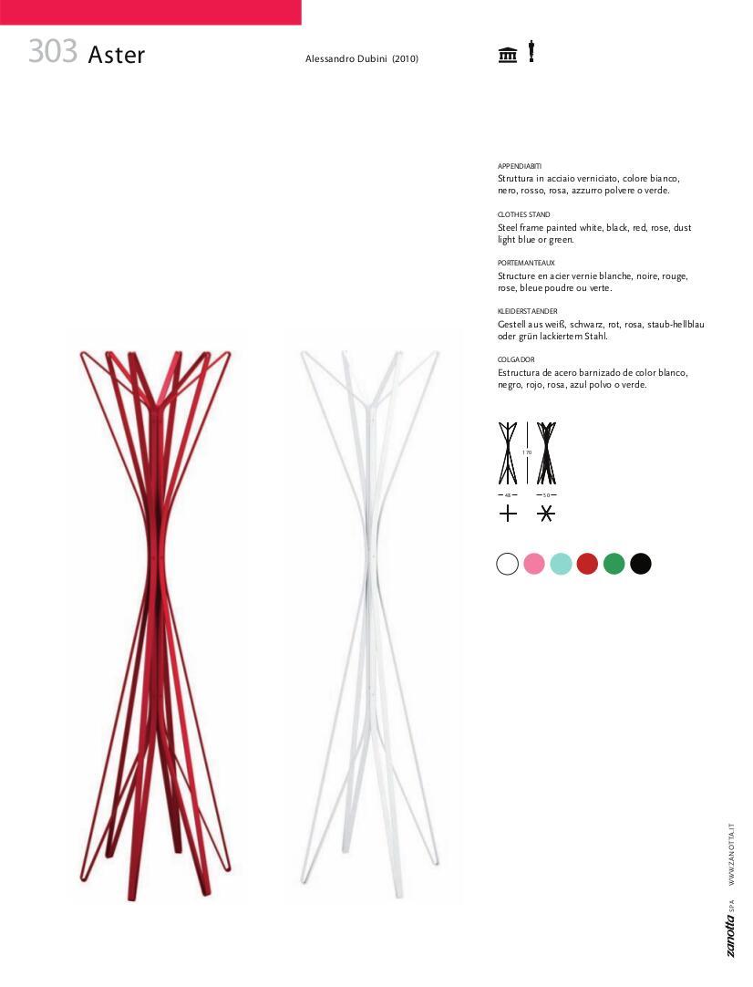 Alessandro Dubini, geboren 1975 in Lugano, Schweiz, designte die Garderobe Aster für den italienischen Möbelhersteller Zanotta. 1954 gegründet, fokussiert sich der Hersteller Zanotta sowohl auf Designklassiker als auch auf neuere Produkte im Bereich Industriedesign. Das filigrane Gestell der Garderobe besteht aus lackiertem Stahl und wirkt aufgrund der Anordnung der einzelnen Elemente trotz des robusten Materials grazil. Im Jahr 2010 wurde das Design der Garderobe mit dem Good Design Award ausgezeichnet, außerdem ist sie Teil der Ausstellung im The Chicago Athenaeum.
