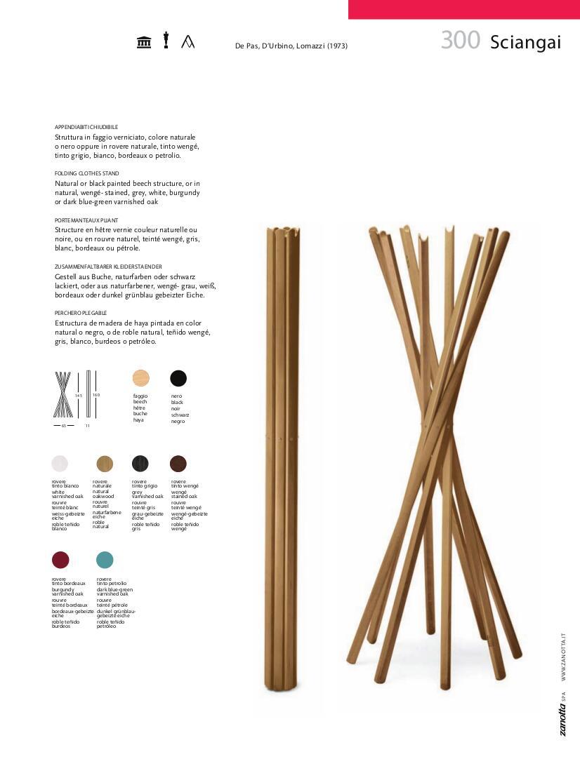 Das Designer-Trio Jonathan de Pas, Donato D'Urbino und Paolo Lomazzi entwarf die Garderobe Sciangai für das italienische Familienunternehmen Zanotta. Optisch erinnert der aus Vollholz gefertigte und in verschiedenen Holz- und Farbvarianten erhältliche Garderobenständer an das bekannte Spiel Mikado. Die Anordnung der Holzelemente verleiht der Garderobe Sciangai eine gewisse Leichtigkeit und Dynamik, wodurch sie sich harmonisch in jeden Eingangsbereich einfügt. Der 1954 gegründete Hersteller Zanotta steht für italienisches Industriedesign und konzentriert sich sowohl auf Designklassiker als auch auf neuere Produkte. Die gesamte Produktion findet in Italien statt, auch die Zulieferer stammen aus der Region.