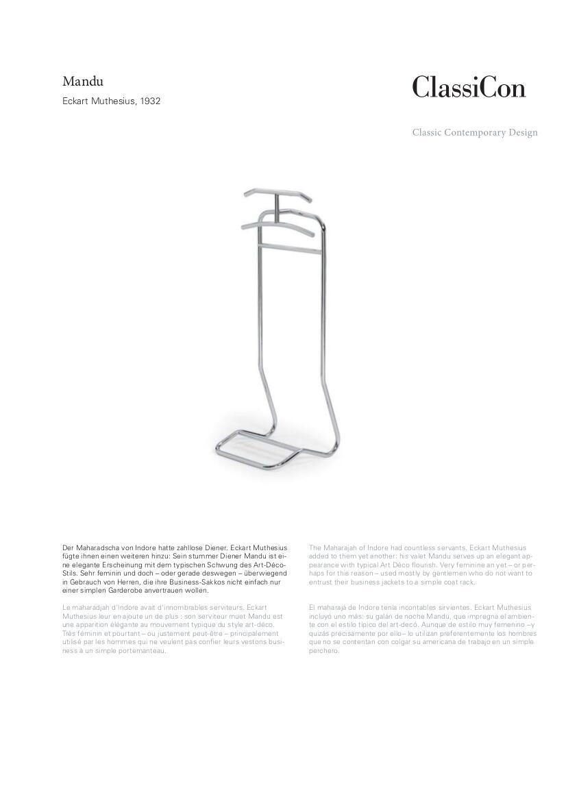 Der Mandu Kleiderständer von ClassiCon ist ein Design des Architekten und Innenarchitekten Eckart Muthesius, der die Aufbewahrungsmöglichkeit für Sakkos für den Palast des Maharadschas von Indore entwarf. Die kleine Garderobe erfreut auch heute noch Liebhaber des Art déco.