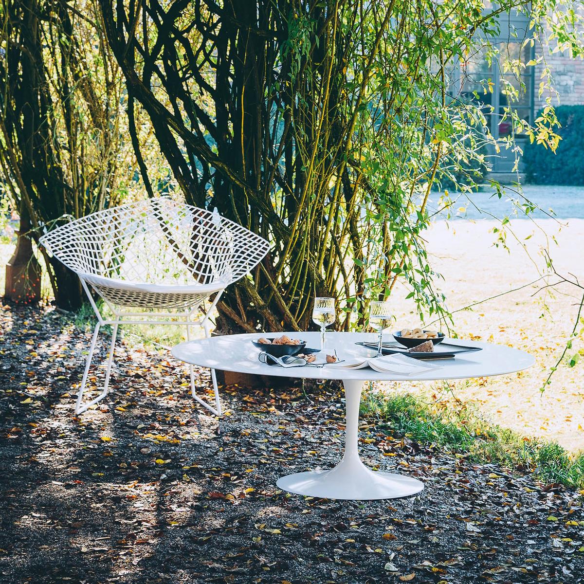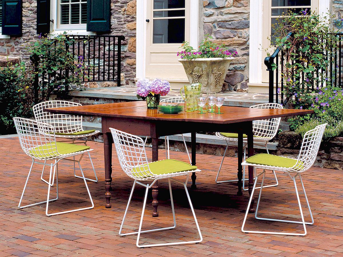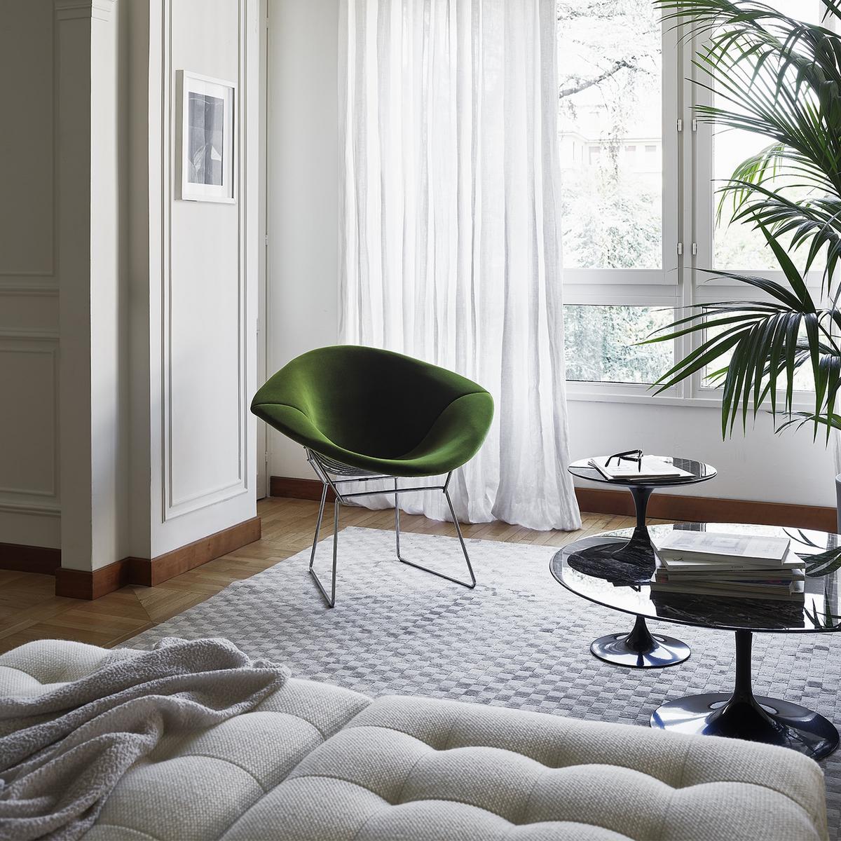 Der Diamond Chair ist nicht einfach ein Sessel: Vielmehr hat der Bildhauer und Designer Harry Bertoia mit dem Diamond Chair eine Skulptur aus filigranem Stahl geschaffen, die ästhetische Leichtigkeit und Grazilität mit physischer Stabilität verbindet - ein revolutionäres Beispiel für die Verbindung von Kunst und Möbeldesign. Die organisch geschwungene Netzstruktur des Stuhls schmiegt sich perfekt an den Körper an und wirft im Sonnenlicht einen charakteristischen Schatten.