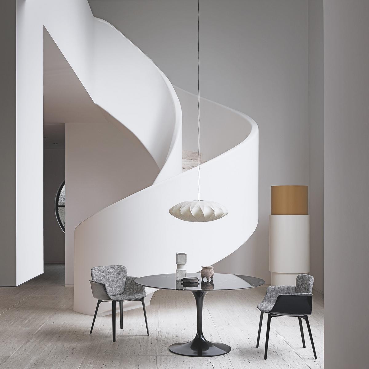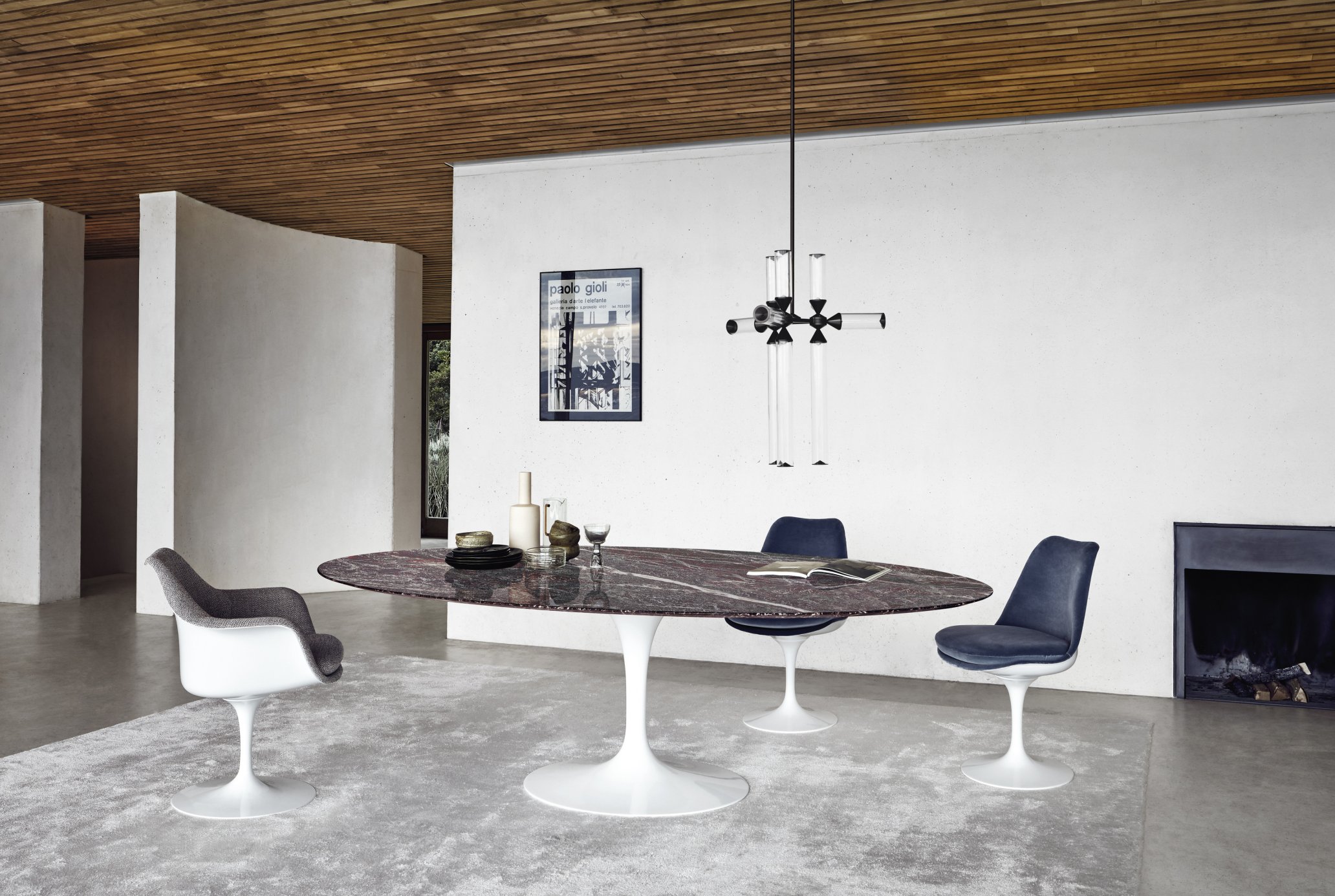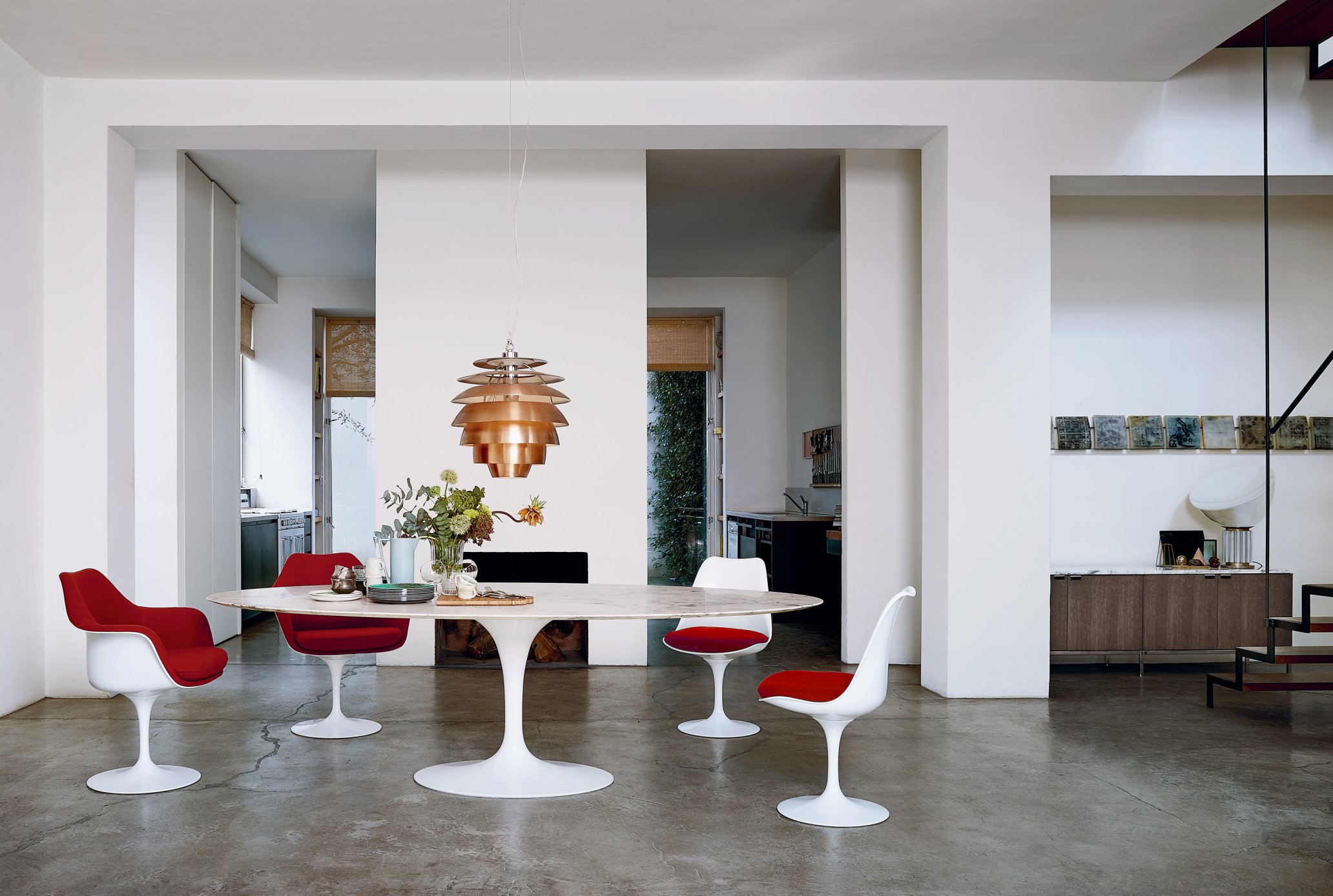Der finnische Designer Eero Saarinen studierte Bildhauerei und Architektur in Paris und Yale. An der Cranbrook Academy nahm er einen Lehrauftrag an und lernte den Designer Charles Eames kennen, mit dem ihn fortan eine enge Freundschaft und Zusammenarbeit verband. Für Knoll International schuf Saarinen mit seiner Pedestal Collection zeitlose Klassiker. Dazu gehören neben dem Tulip Chair die passenden Saarinen Esstische, Beistelltische und Couchtische. Saarinen störte sich an den „unordentlichen“ Stuhl- und Tischbeinen herkömmlicher Möbel und entwickelte stattdessen Modelle, die auf einem einzigen zentralen Sockel ruhen. Die organisch-eleganten Formen der Pedestal-Kollektion gelten bis heute als Symbol für futuristisches Design und zählen zu den wegweisenden Entwürfen der Designgeschichte des 20. Jahrhunderts.