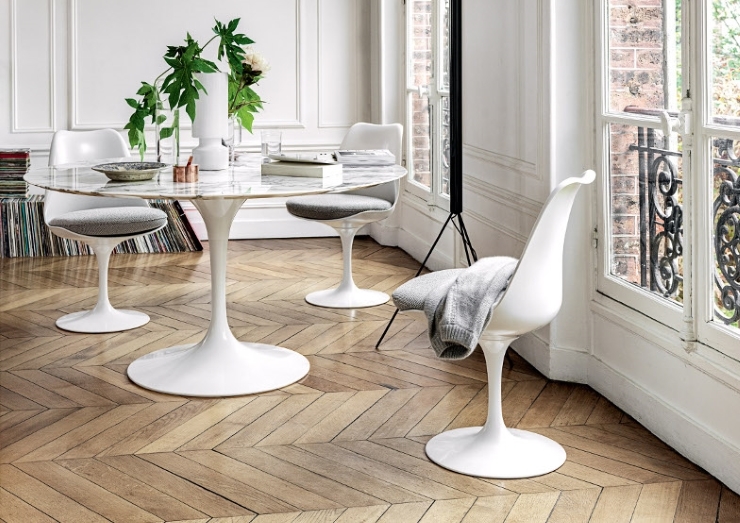 Mit dem Tulip Chair verabschiedete sich Eero Saarinen 1956 von den traditionellen vier Stuhlbeinen und revolutionierte damit das Möbeldesign. Seinen Namen Tulip Chair - Tulpenstuhl - verdankt der Entwurf dem einbeinigen, schlanken, kelchförmigen Gestell aus Aluminium und der organisch geformten Sitzschale. Das damals absolut futuristische Design brachte dem Tulip Chair in den 1960er Jahren eine Rolle in der Science-Fiction-Serie Star Trek ein.