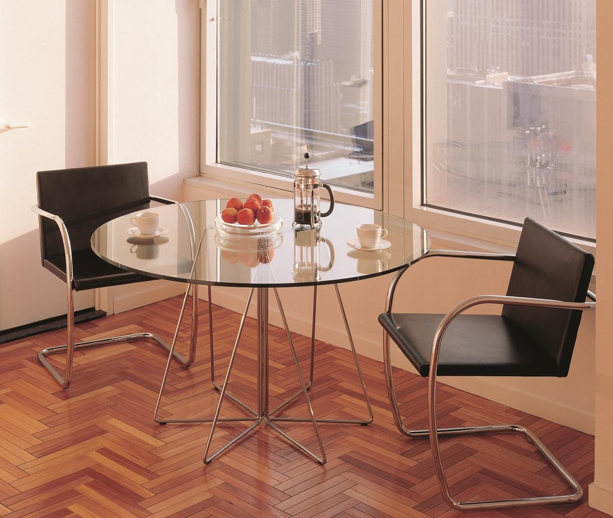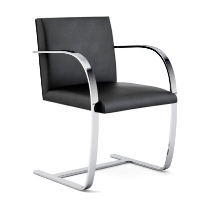 Die Entstehungsgeschichte des Mies van der Rohe Brno Stuhl ist eng verbunden mit der Villa Tugendhat in Brünn, Tschechien. Diese zählt zu den bedeutendsten Entwürfen Ludwig Mies van der Rohes und als Meilenstein der modernen Architektur. Parallel zum Barcelona-Pavillon entstanden, hat Mies van der Rohe bei diesem Entwurf für das Unternehmer-Ehepaar Tugendhat nicht nur das Gebäude entworfen, sondern zeichnet auch für etliche Möbel verantwortlich. Hier kommt der elegante Freischwinger mit dem unaussprechlichen Namen ins Spiel: Der Knoll Stuhl Brno, nach dem tschechischen Namen Brünns benannt, steht in der Villa Tugendhat 24-fach im Esszimmer. Entsprechend der mondänen Eleganz des Hauses - am Hang gelegen, mit flachem Dach auf Chromstahlstützen und breiten Glasfronten - ist der Mies van der Rohe Freischwinger mit extravagantem Schwung und bequemer Polsterung entworfen, ohne dass sein Komfort den puristischen Eindruck stören würde. Typisch für die Formensprache Mies van der Rohes ist auch der Stuhl Brno auf seine essentiellen Elemente reduziert und bringt diese in einen atemberaubend ästhetischen Zusammenhang. Knoll International produziert den Designklassiker aus hochglänzend oder satiniert verchromtem Spezialfederstahl, der mit Leder in vielen verschiedenen Ausführungen bezogen ist. Die Polsterung erfolgt über einen schaumstoffbezogenen Hartholz-Innenrahmen mit Nosagfederung.
