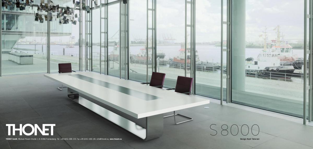 Der Thonet Konferenztisch S 8000 wirkt aufgrund seiner edlen Materialien und seiner imposanten Erscheinung wie eine Skulptur im Raum und ist auf Wunsch durch verschiedene Multimedia-Module erweiterbar. Entworfen wurde der Thonet Tisch von dem Architekten Hadi Teherani, dessen Designs in einigen bekannten Filmen wie Star Trek und James Bond eingesetzt wurden.