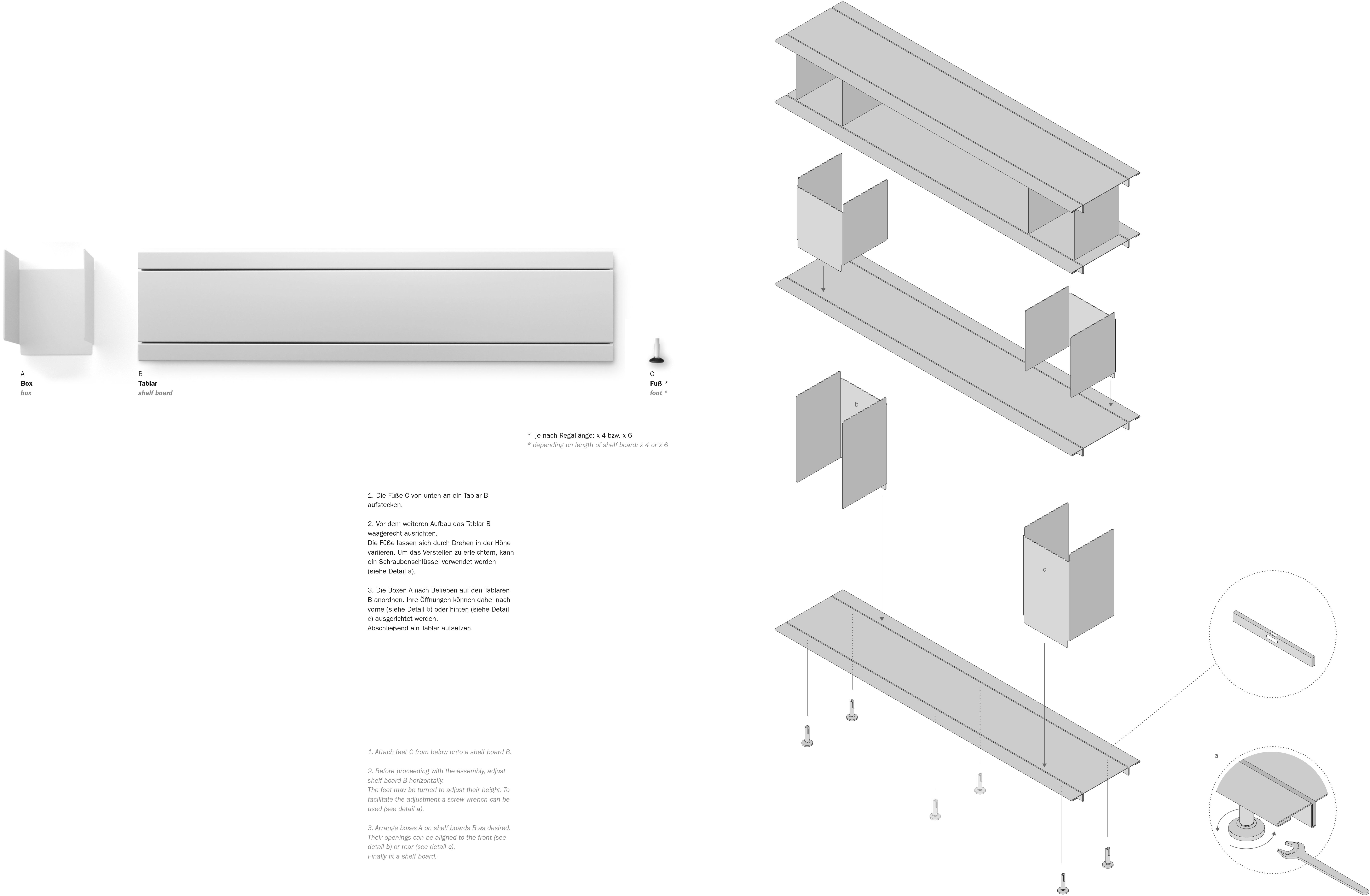 | Material | Tablare und Boxen: Stahl pulverbeschichtet (Feinstruktur matt) oder Aluminium unbehandelt Füße: Aluminium pulverbeschichtet oder Aluminium unbehandelt, Polyamid (PA 6) |