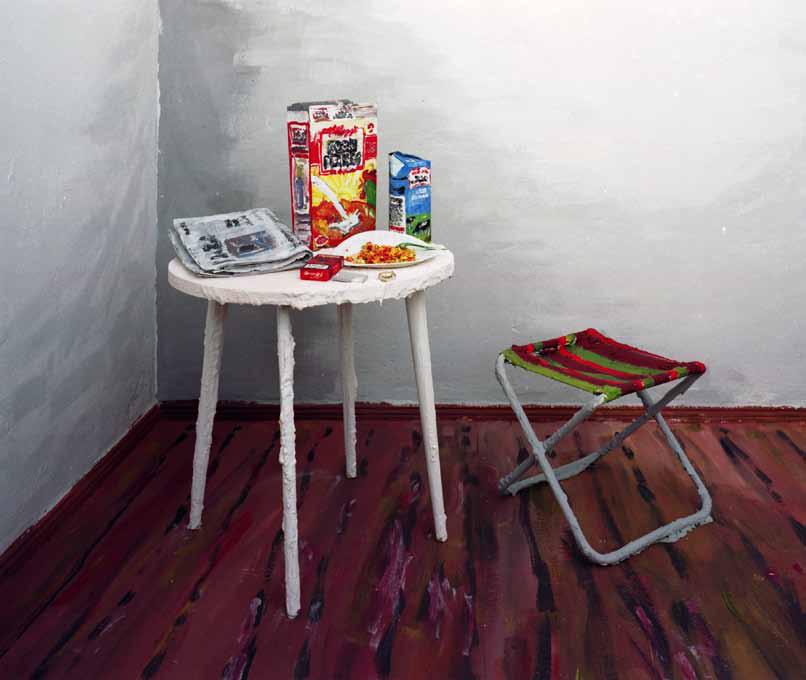 Georg Brückmann: Ja, es war ein relativ langer Prozess. Es hat alles vor ca. vier Jahren angefangen. Dies ist eine der ersten Arbeiten [zeigt uns "Tisch mit Stuhl"]. Ich habe hier kaum etwas verändert oder abgewandelt, sondern einfach die Gegenstände angemalt. Alles sehr einfach. Es gibt einen Tisch, einen Hocker; all die Dinge standen in meinem Raum und was man auf dem Foto sieht, wurde angemalt. Der Milchkarton ist angemalt, die Kellogg's Packung ist angemalt, die Wand ist ein bisschen angemalt für den Schatteneffekt. Es geht um die Wahrnehmung von Malerei und Fotografie, und ein wenig um das Bildgedächtnis: dies hier ist eindeutig Kellogg's, es sind Cornflakes. Man glaubt es lesen zu können, kann es aber nicht - weil da nichts geschrieben ist.