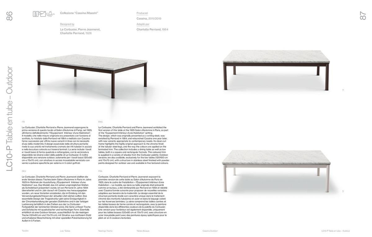 Der LC10-P Outdoor-Tisch bekam im September 2022 eine neue Bezeichnung und wurde von Cassina selbst in Table en tube basse, Grand Modèle, Outdoor umbenannt.