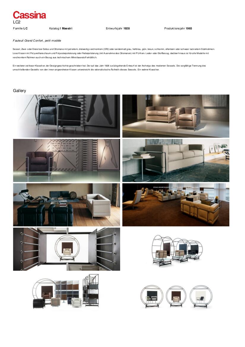 ...Die bekanntesten Werke ihrer Zusammenarbeit sind die von Cassina produzierten LC4 Chaiselongue, LC2 Sessel und der LC7 Drehstuhl welche Le Corbusier, Pierre Jeanneret und Charlotte Perriand ehemals für ihr "Maison la Roche" in Paris kreiert haben...