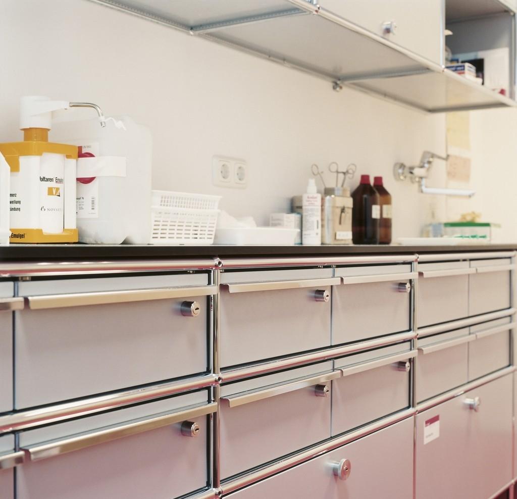 Von der Theke bis zum Behandlungszimmer kann das individuell konfigurierbare Regalsystem von USM Haller vielseitig und auf Ihre persönlichen Bedürfnisse maßgeschneidert eingesetzt werden – die Möglichkeiten sind hier schier unendlich. Ob Resopalbeschichtung, vielseitiges Aufbewahrungszubehör oder eigens auf Ihre Räumlichkeiten zugeschnittene, ganzheitliche Systeme: Die flexiblen USM Haller Möbel eignen sich ideal für die Einrichtung Ihrer Klinik- oder Praxisräume. Das USM Haller Regalsystem ist individuell konfigurierbar, qualitativ hochwertig, zeitlos und langlebig, und komplettiert so jede Arztpraxis oder Klinik auf zielgerichtete Weise.