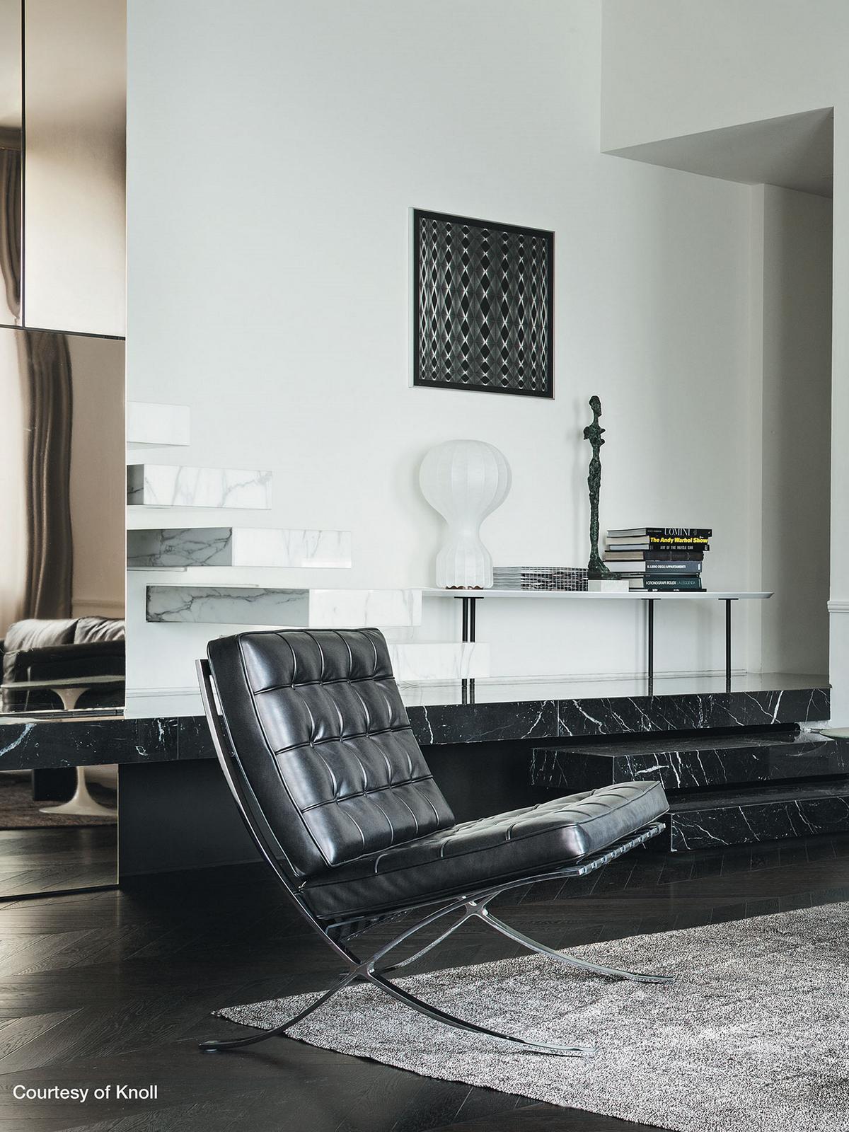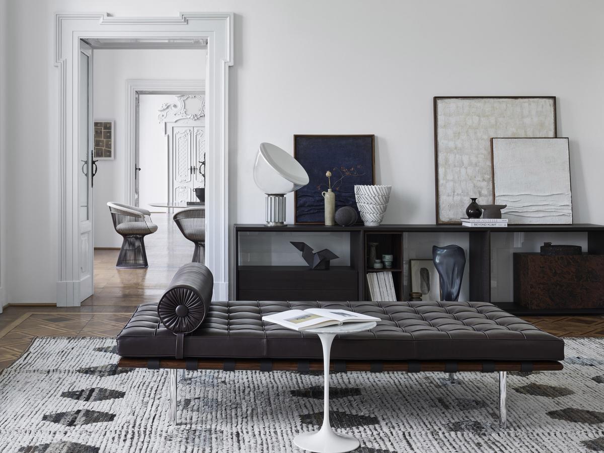 Barcelona Sessel, Barcelona Hocker und Barcelona Liege bilden eines der edelsten Möbel-Ensembles und einen Höhepunkt der modernen Designgeschichte. Die sogenannte Knoll Barcelona Kollektion wurde für den Empfang des spanischen Königspaares im Deutschen Pavillon auf der Weltausstellung 1929 in Barcelona von Ludwig Mies van der Rohe entworfen. Der legendäre Architekt hatte vorerst nur den Barcelona Sessel mit passendem Hocker für diesen Anlass entworfen, ergänzte das Set jedoch schon ein Jahr später durch die passende Barcelona Liege. Heute werden die Barcelona Möbel von Knoll International im charakteristischen Materialmix aus Stahlrohr und hochwertigem Lederbezug mit Kedernähten hergestellt. Auch rund 100 Jahre nach ihrer Lancierung haben die Barcelona Möbel dabei nichts von ihrer Aktualität eingebüßt. Nach wie vor stehen sie sinnbildlich für die Moderne und verbinden par excellence Luxus, klare Formen und einen kühlen Minimalismus.