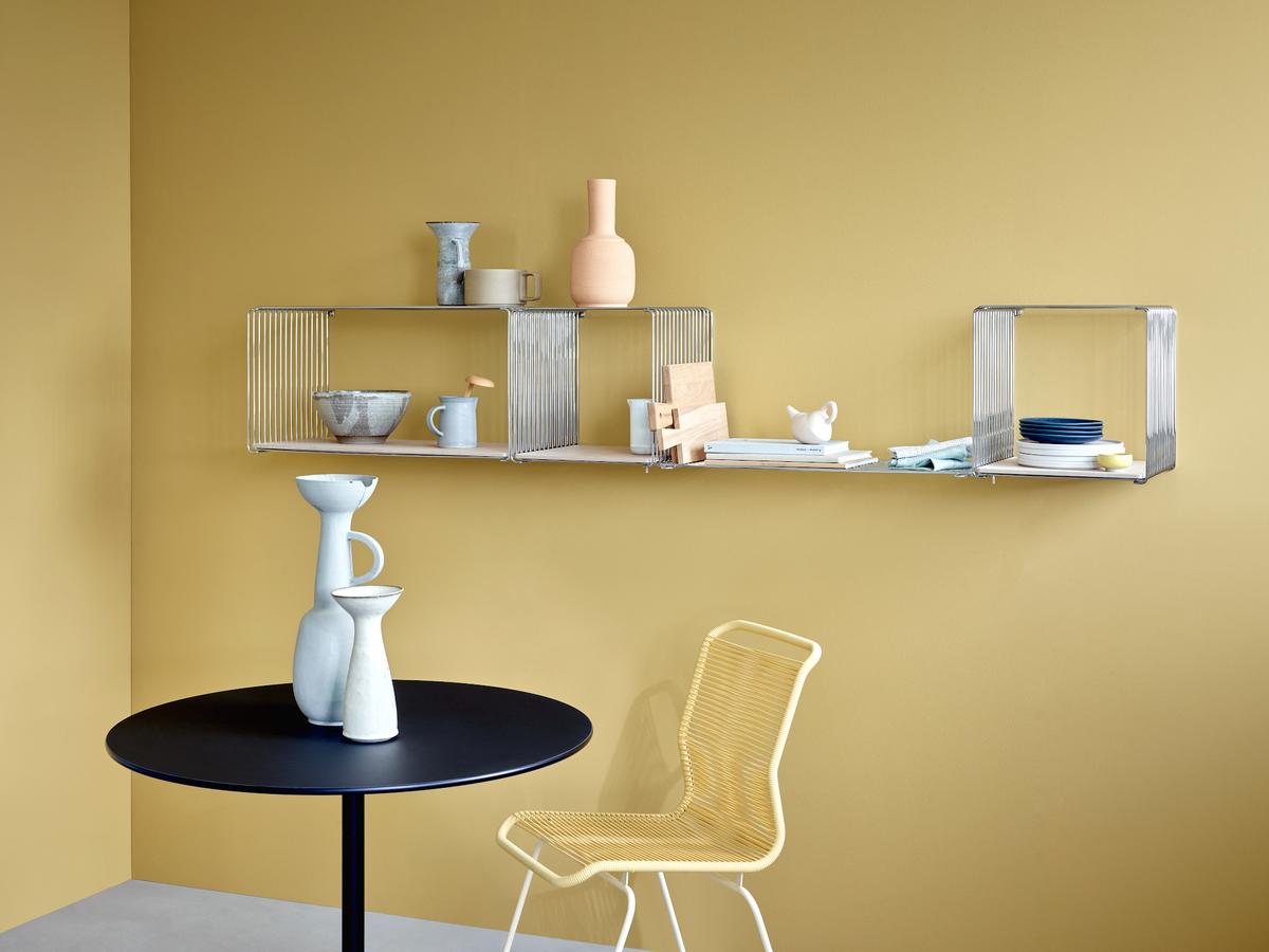 Mit dem Drahtregal Panton Wire von Montana entwickelte Verner Panton in den frühen 1970er Jahren ein universell einsetzbares Designobjekt. Dank der filigranen nebeneinander angeordneten Metallstreben wirkt das experimentelle Regal leicht und elegant, zeugt aber zugleich von industriellem Charakter. Panton Wire Elemente können einzeln verwendet oder mithilfe von Clips zu größeren Einheiten wie Raumteilern verbunden werden, in Kombination mit einer Abdeckplatte wird das Möbel im Handumdrehen zum Couchtisch. Designer Verner Panton gründete 1955 sein eigenes Studio für Design und Architektur und sorgte mit seinen Möbelentwürfen für Aufsehen, die sich vor allem durch geometrische Formen und kräftige Farben auszeichnen. Ende der 1950er Jahre entwickelte Panton den berühmten und nach ihm benannten Panton Chair für Vitra, der heute zu den bedeutendsten Klassikern der Designgeschichte gehört.