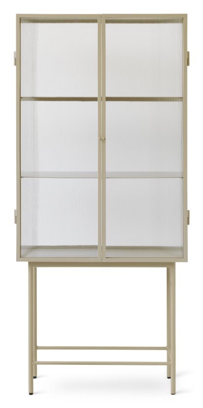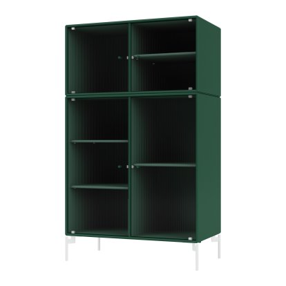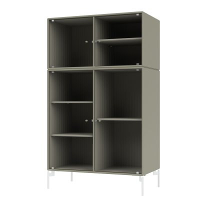 Der von Peter J. Lassen entworfene Ripple III Vitrinenschrank von Montana, dessen Farbpalette vielfältige Optionen bietet, präsentiert sich als elegante, mittelgroße Vitrine mit vier Türen aus geriffeltem Glas. Sein Design ermöglicht eine flexible Nutzung als Highboard im Wohnzimmer oder als ansprechende Präsentationsfläche für Geschirr in Küche oder Esszimmer. Die obere Ablage setzt Leuchten, Vasen und Bilder in Szene, während vier verstellbare Einlegeböden eine individuelle Stauraumorganisation erlauben.