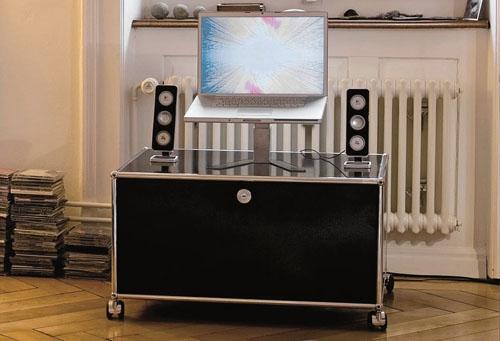 Mit dem vielfältigen USM Möbelbausystem lassen sich Möbel für verschiedenste Zwecke entwerfen, z. B. als HiFi- und TV-Möbel.