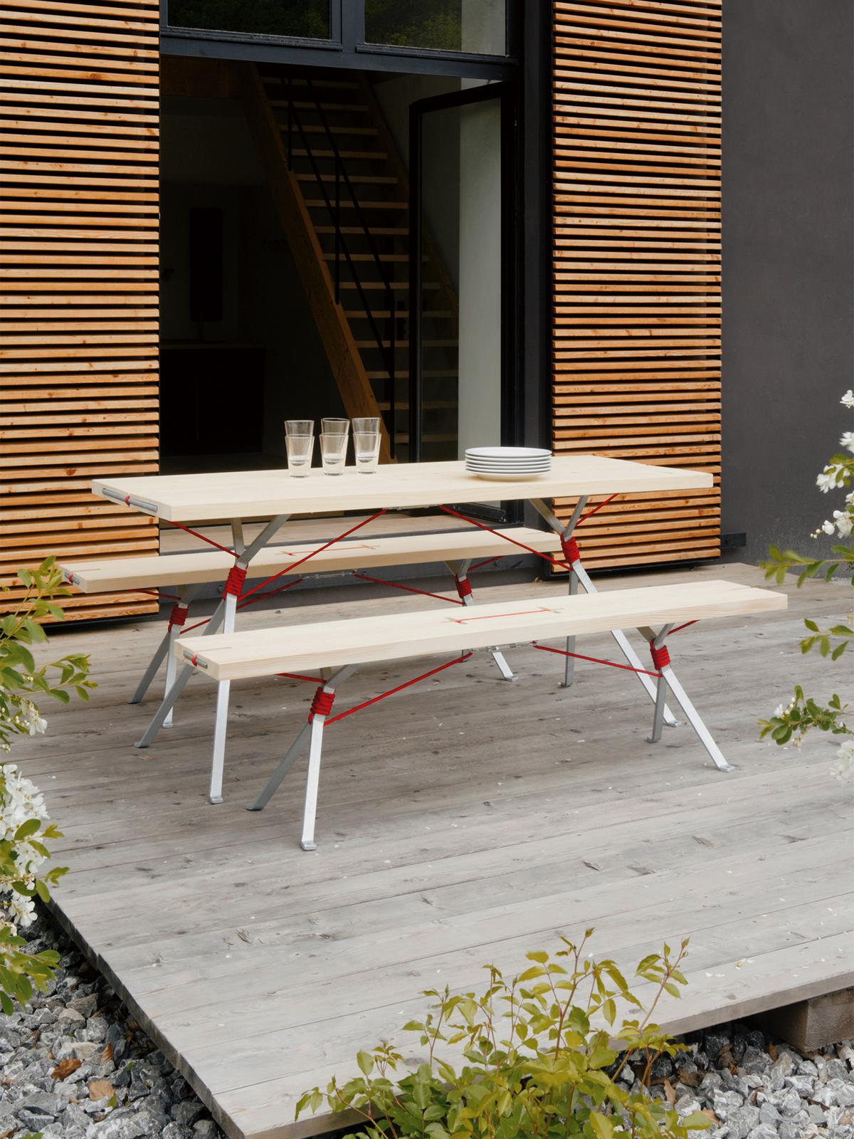 Kampenwand Bank und Tisch von Nils Holger Moormann (Tannenholz) mit und ohne Rückwand