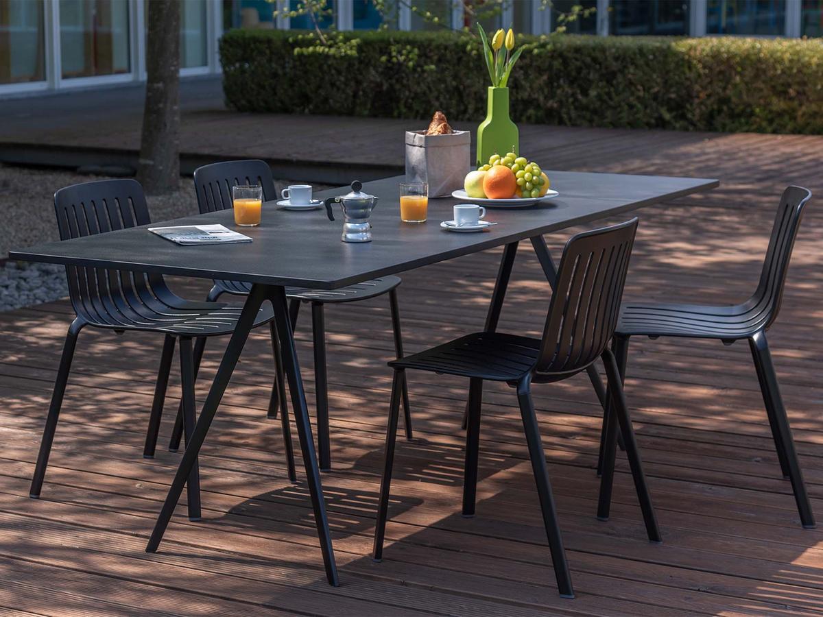 Der Outdoor-Tisch Linear von Muuto bietet ein sehr stabiles und harmonisches Ensemble aus Metall
