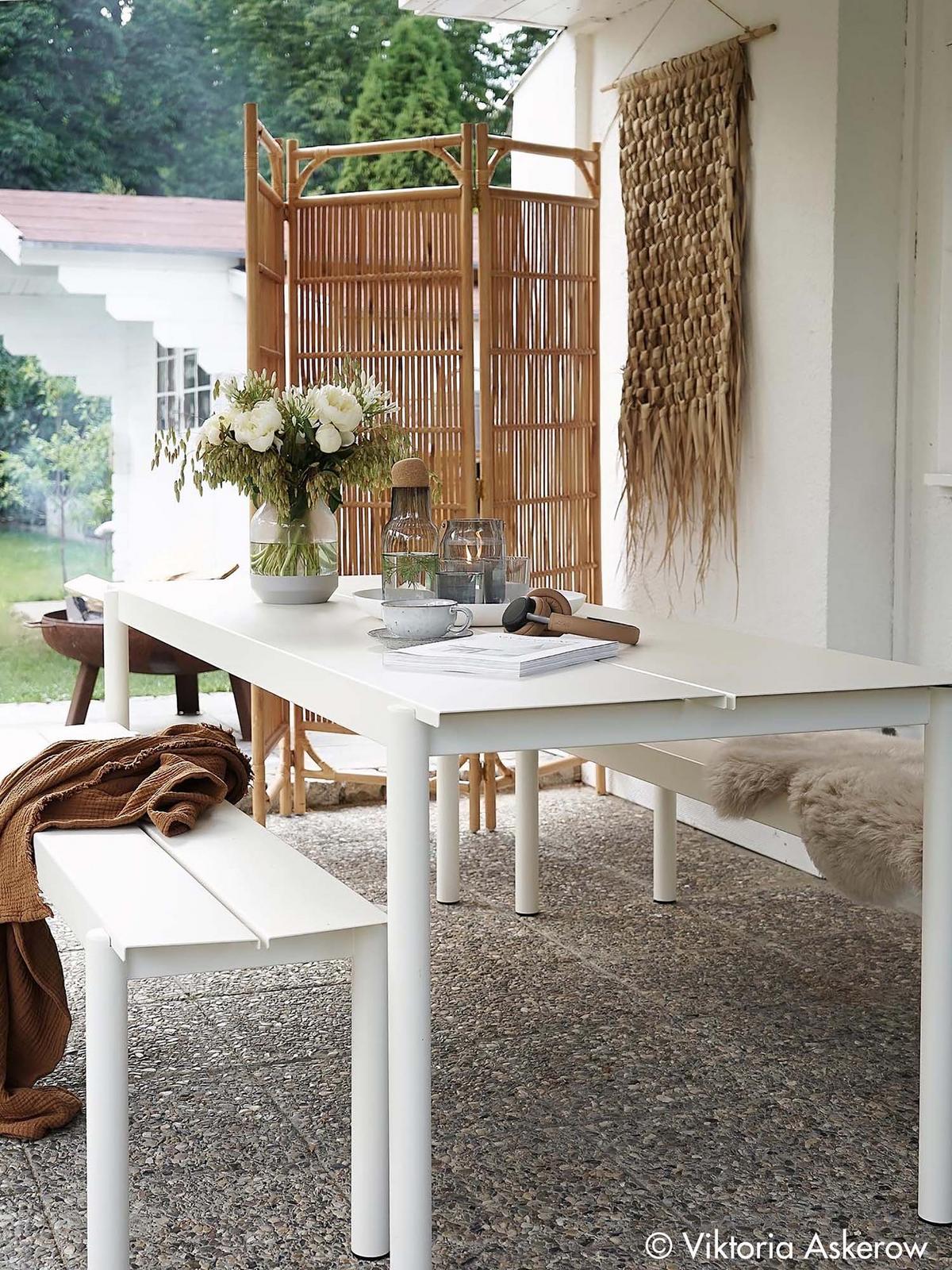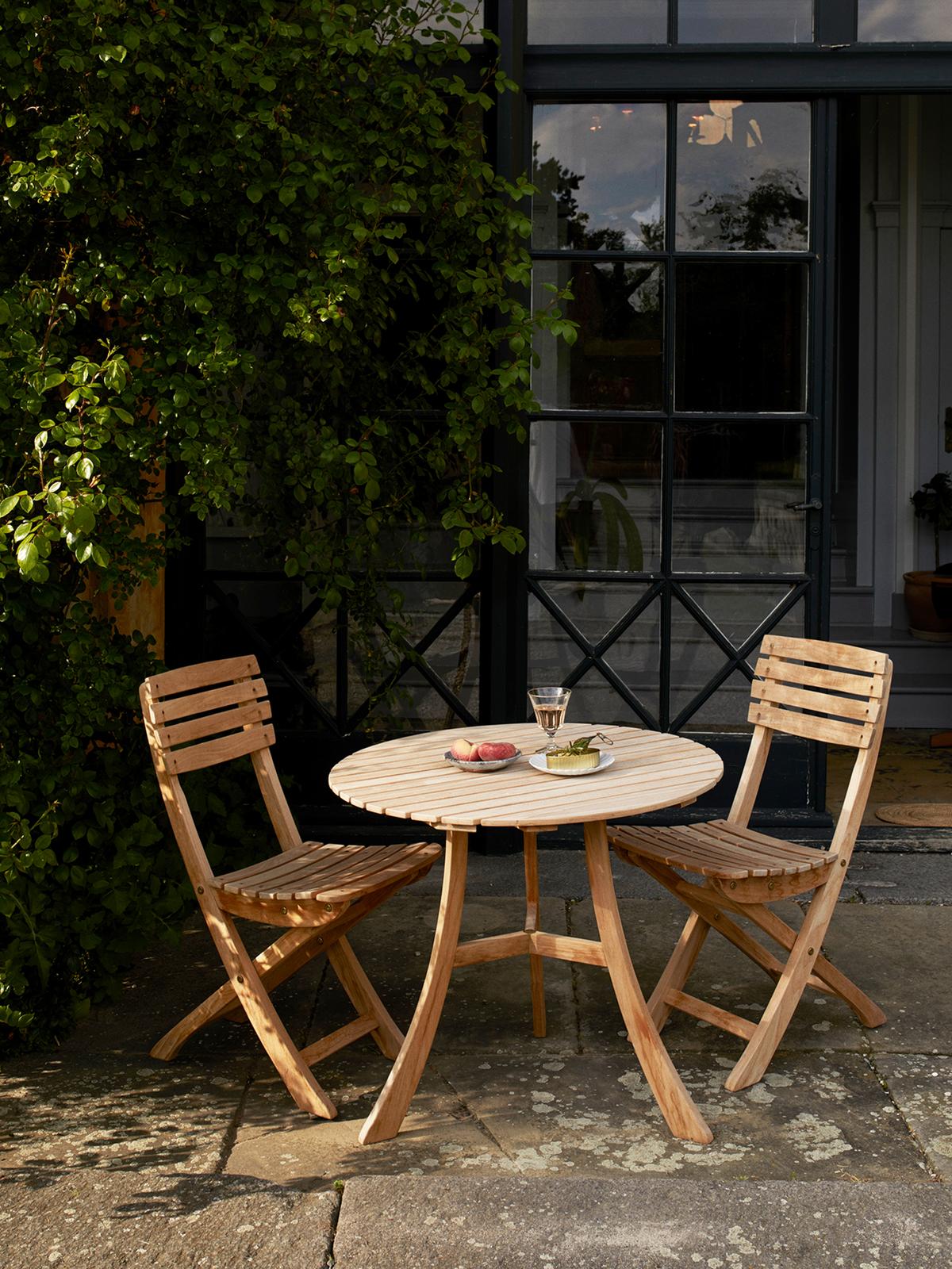 Kunststoff ist besonders widerstandsfähig, aber auch Modelle aus Teakholz wie beispielsweise der Skagen Tisch von Skagerak eignen sich optimal für die Nutzung im Garten oder auf der Terrasse.
