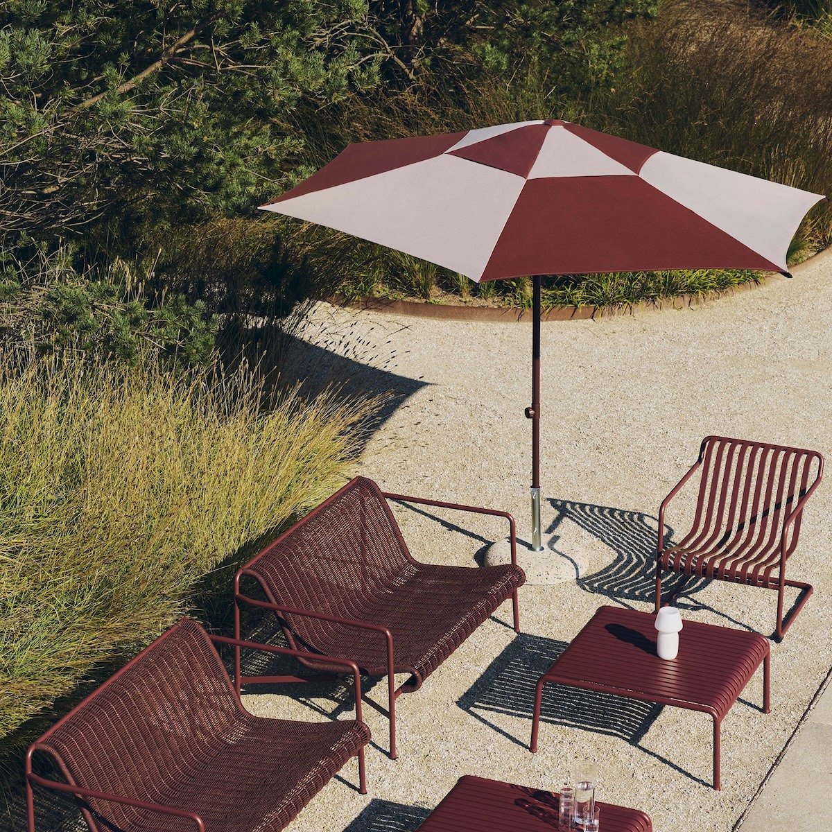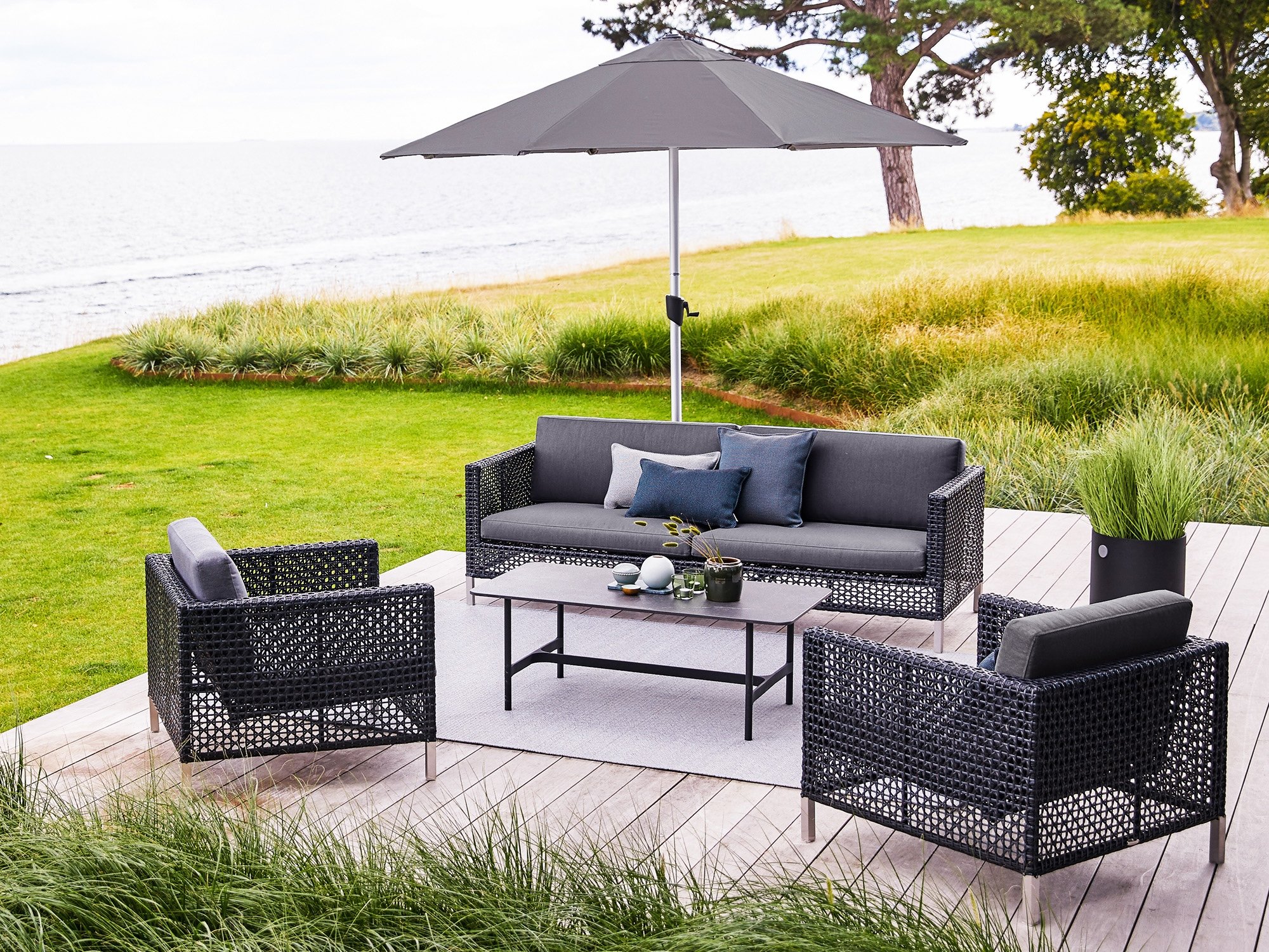 Sonnenschirme sind als dekorative und nützliche Accessoires die perfekte Ergänzung für Ihren Außenbereich und lassen sich als stilvolles Einzelstück mit bereits vorhandenen Gartenmöbeln kombinieren. Hier sollte man darauf achten, Materialien, Design und Maße aufeinander abzustimmen. Wer auf Einheitlichkeit besonderen Wert legt, kombiniert seinen Sonnenschirm mit Gartenmöbeln desselben Herstellers. Labels wie Cane-line bieten Kollektionen in verschiedenen Stilrichtungen, die vom Esstisch und Stuhl bis zum Outdoorsofa perfekt aufeinander abgestimmt sind.
