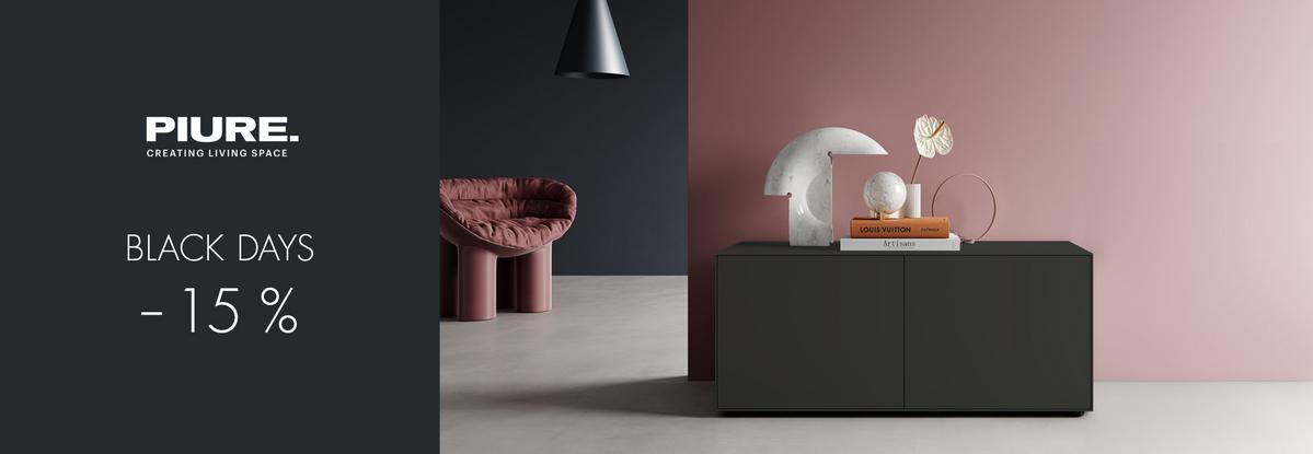 Entdecken Sie jetzt die Piure Regale, Sideboards und Schränke in unseren Black Friday Angeboten. Bis zum 6. Dezember 2024 erhalten Sie auf alle Piure Artikel bei uns im Shop 15 % Rabatt.