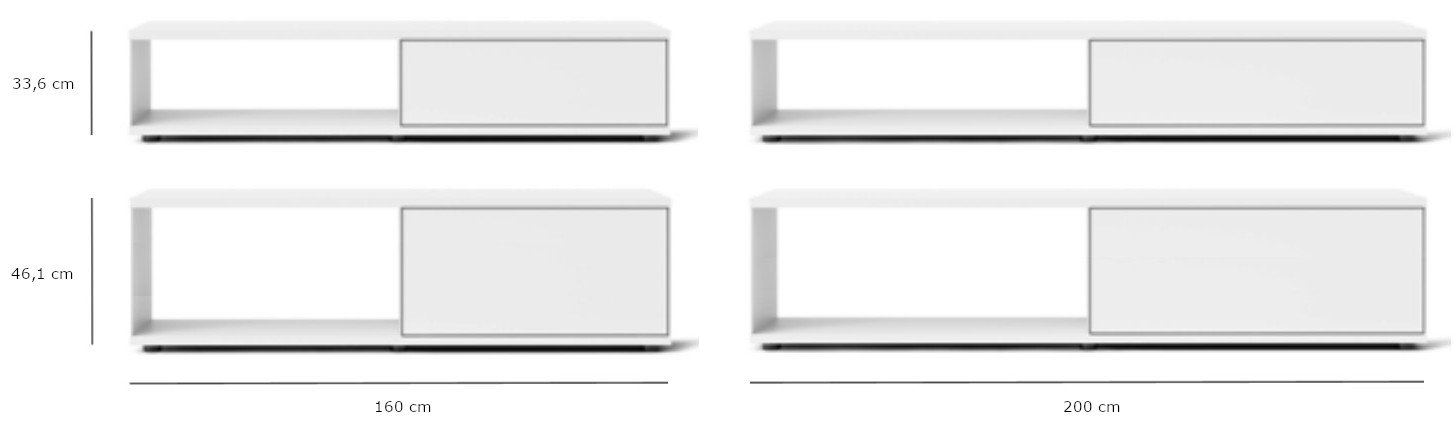 | Abmessungen | Höhe: 30,6 cm / 43,1 cm zuzüglich 3 cm Gleiter Breite: 160 cm / 200 cm Tiefe: 40,4 cm Regalböden je 2,8 cm Schubkasteneinsatz: Außenmaße: B 80 / 100 cm x H 25 cm x B 40 cm Innenmaße: B 71,5 / 91,5 cm x H 16,9 cm (Zarge 13,8 cm) cm x B 40 cm Klappeneinsatz: Außenmaße: B 80 / 100 cm x H 37,5 cm x T 40 cm Innenmaße: B 75,6 / 95,6 cm x H 33,7 cm x T 36 cm |