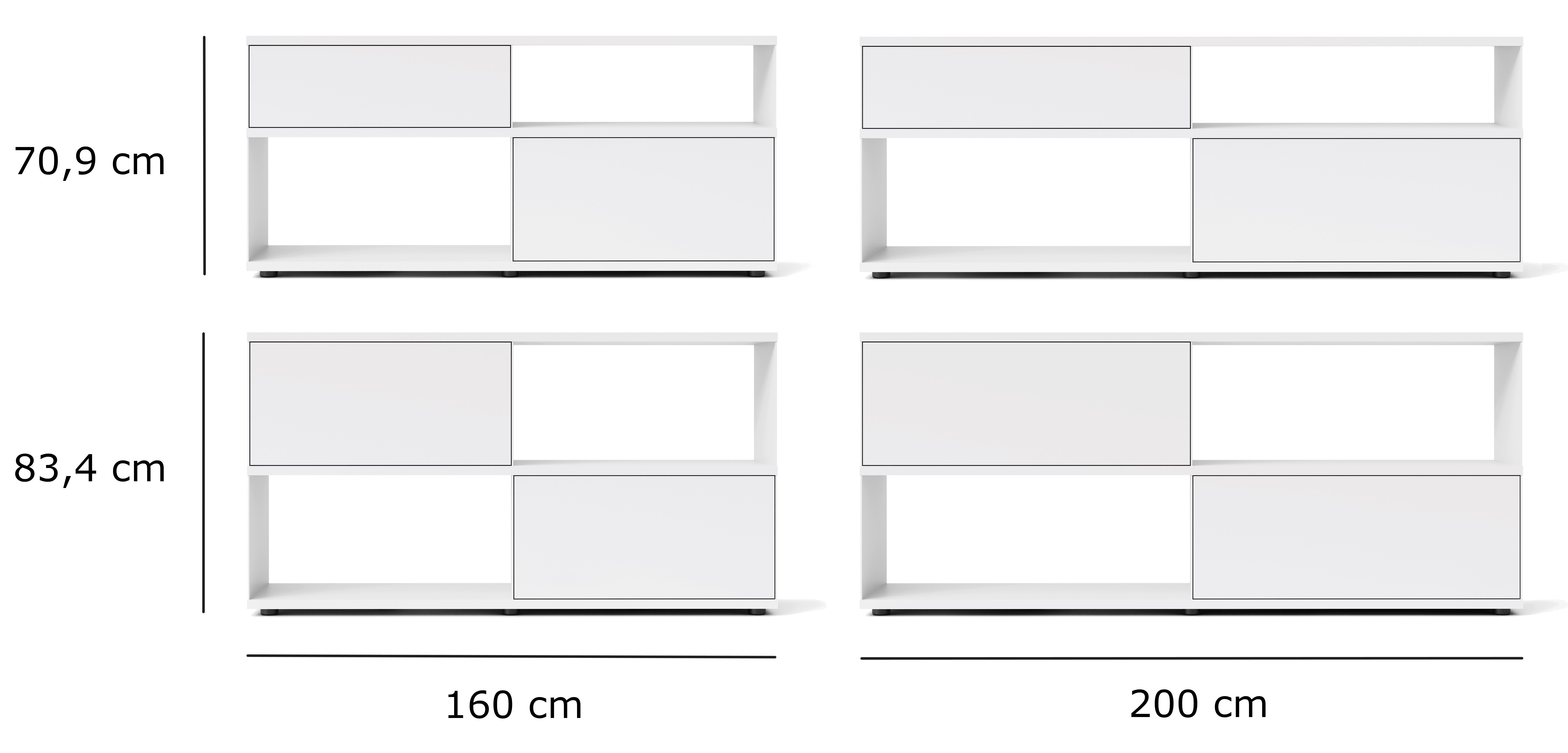 | Abmessungen | Höhe: 70,9 cm / 83,4 cm zuzüglich 3 cm Gleiter Breite: 160 cm / 200 cm Tiefe: 40,4 cm Regalböden je 2,8 cm Schubkasteneinsatz: Außenmaße B 80 / 100 cm x H 25 cm x B 40 cm Innenmaße B 71,5 / 91,5 cm x H 16,9 cm (Zarge 13,8 cm) cm x B 40 cm Klappeneinsatz: Außenmaße B 80 / 100 cm x H 37,5 cm x T 40 cm Innenmaße B 75,6 / 95,6 cm x H 33,7 cm x T 36 cm |