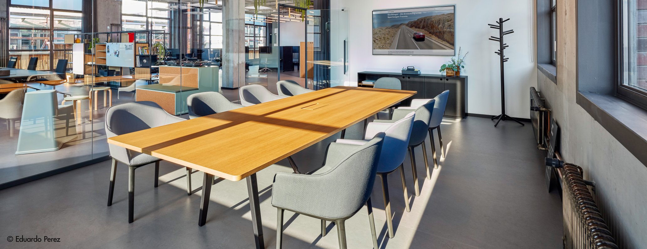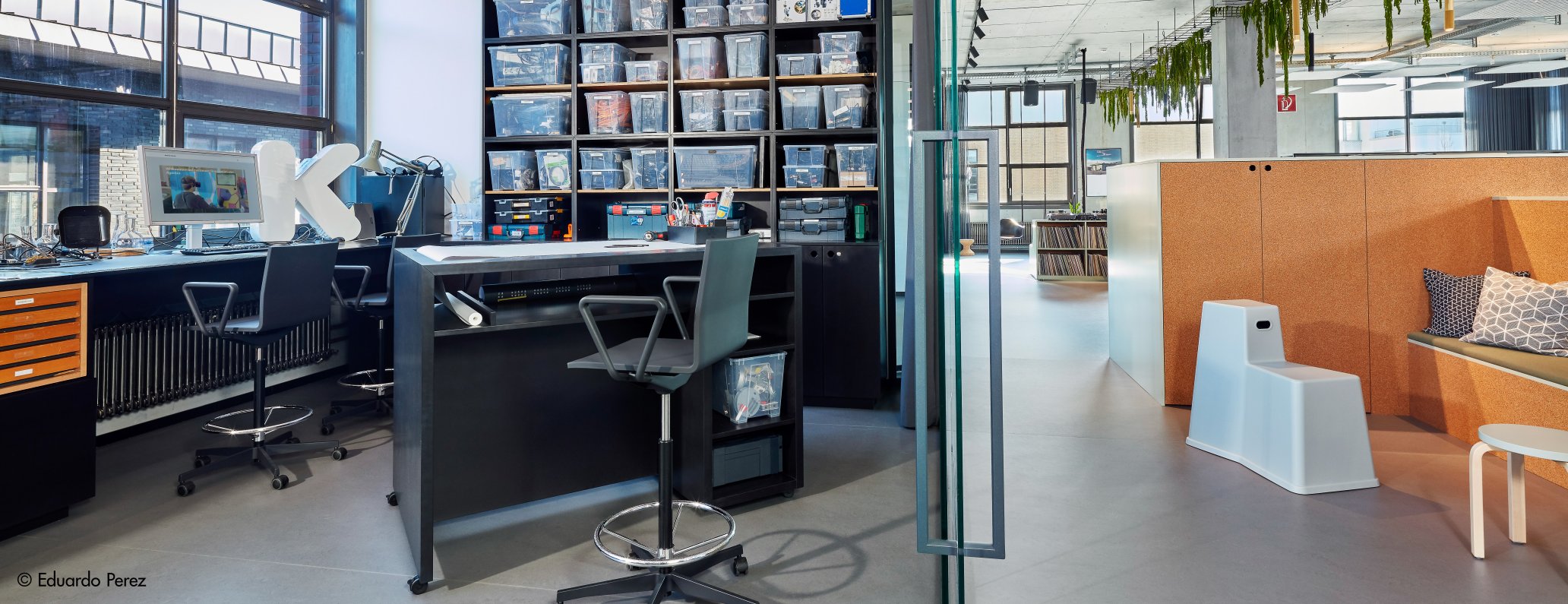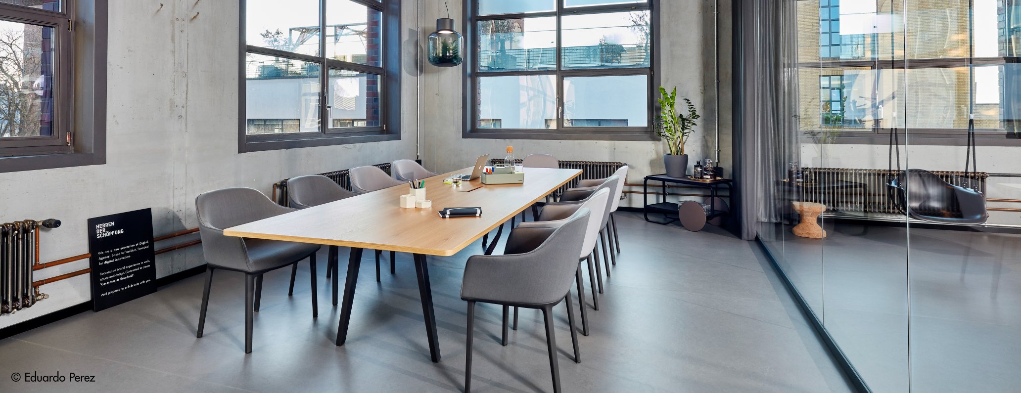 In Strategieworkshops wurden zusammen mit Vitra und smow die Bedürfnisse der Agentur und der Mitarbeiter herausgearbeitet. Das Ergebnis war ein passendes Raumkonzept, welches die verschiedenen Arbeitsplatztypen und Workflows der Agentur berücksichtigt. Ein auf die Herren der Schöpfung abgestimmtes Farb-, Akustik- und Beleuchtungskonzept ergänzte die funktionale Möblierung der Arbeitsplätze, Meeting Points und Labs. Das Herzstück der Agentur bildet die großzügige und mit modernsten Geräten ausgestattete Küche, in der jeden Tag gemeinsam gekocht wird. Flexible Bereiche innerhalb des Büros tragen zukünftigem Wachstum Rechnung und werden heute bereits als vermietete Co-Working-Space genutzt.