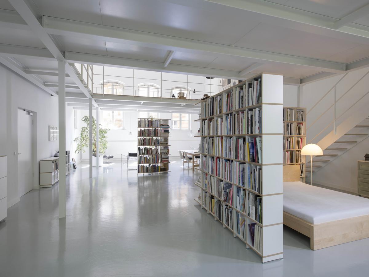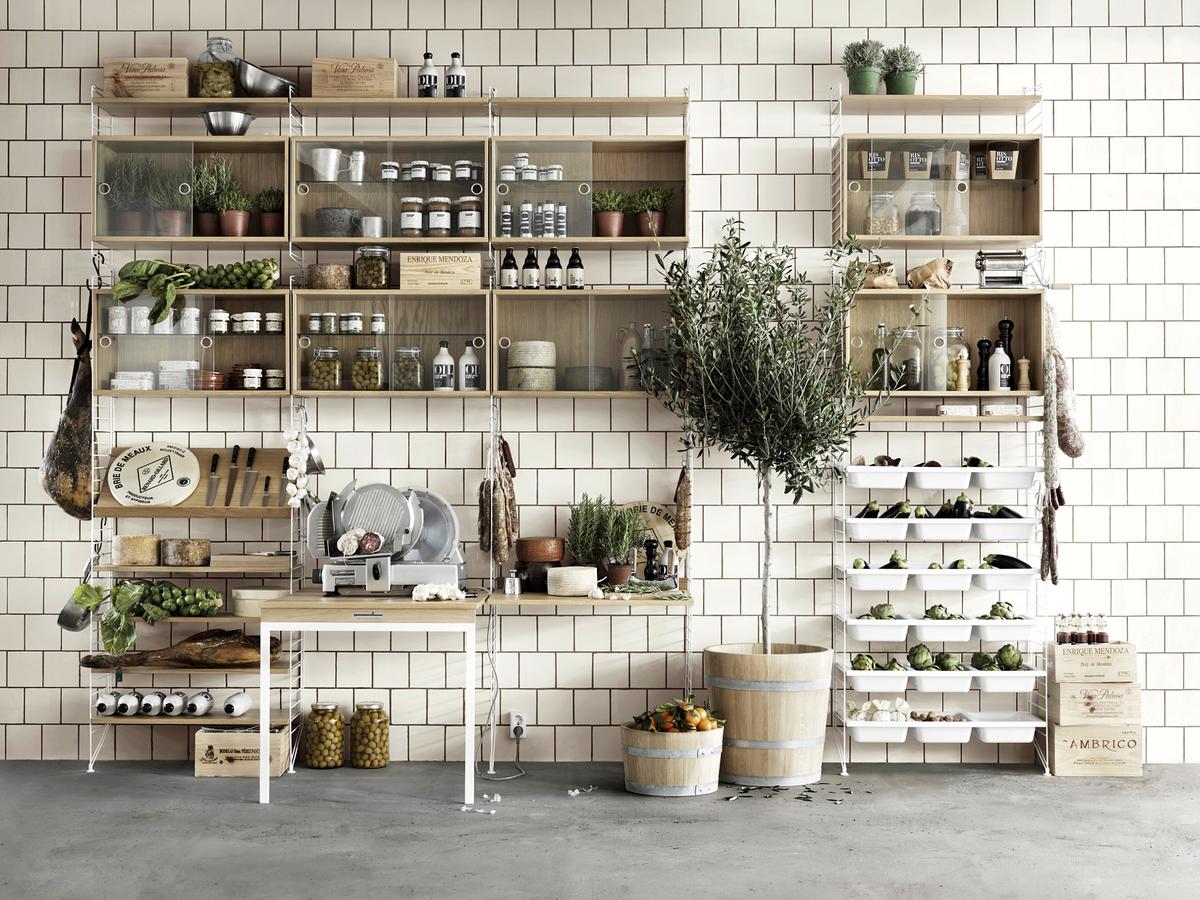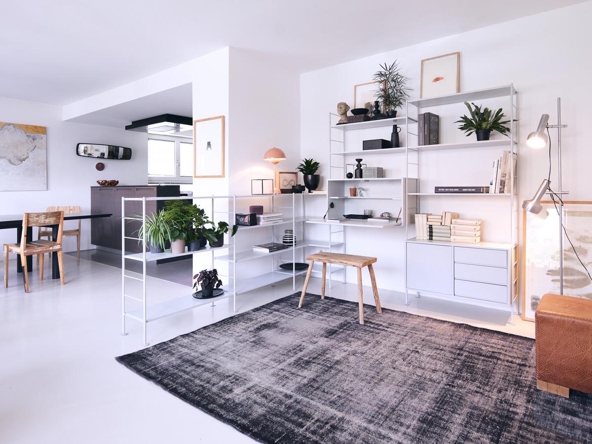 Mit der Regalkonstruktion von String lässt sich in einer einzigen Wohnwand ein Wohn-Schlaf-Essbereich gestalten. So können Ein-Zimmer-Wohnungen oder kleine Zweitwohnungen ohne großen Möbelkauf elegant ausgestattet werden.