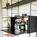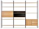 | Material | Leiterelemente: Stahlrohr (16 mm) und Draht (6 mm), pulverbeschichtet Rückwand: MDF (8 mm), lackiert Regalböden: Birke Multiplex (16 mm) mit Eichefurnier, lackiert Schrankelemente: MDF (16 mm) offenporig schwarz lackiert (RAL 9005) oder Eichenfurnier, farblos lackiert |