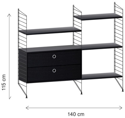 | Lieferumfang | 3 String System Bodenleiter, 115x30 cm 1 String System Regalboden, 78x30 cm 2 String System Ersatz-Regalböden, 78x30 cm 3 String System Regalböden, 58x30 cm 1 String System Schubladenelement |