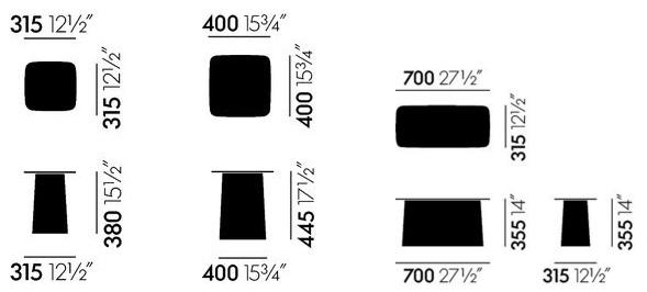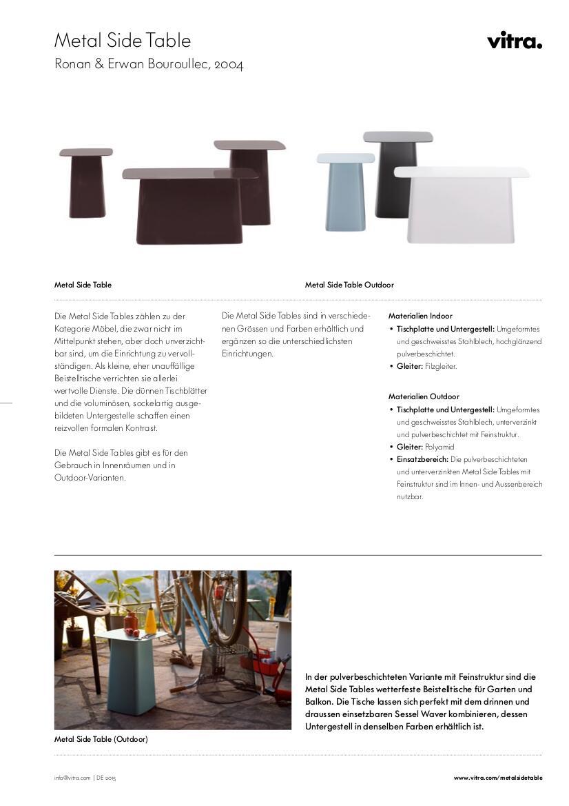 | Ausführungen | In 3 Größen erhältlich Variante Elfenbein in 2 Größen erhältlich Der Metal Side Table explizit für den Innenbereich ist separat in anderen Farben erhältlich. |