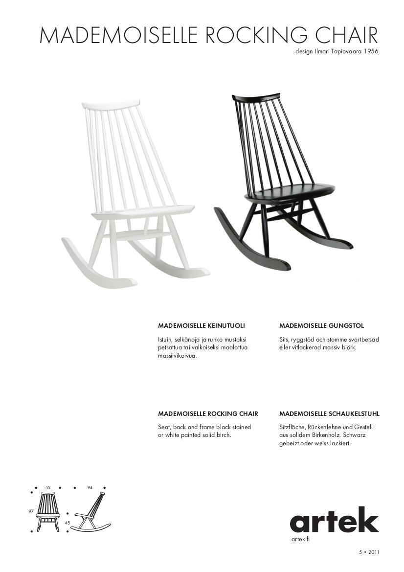 Der Mademoiselle Rocking Chair von Ilmari Tapiovaara ergänzt das Produktportfolio des finnischen Herstellers Artek als eleganter Schaukelstuhl. Bereits Mitte der 50er Jahre entworfen, zählt der Artek Stuhl heute zu den Klassikern des finnischen Möbeldesigns.