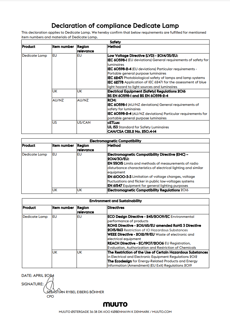| Pflege | Reinigen Sie die Dedicate Leuchte nur mit einem weichen, trockenen Tuch. Schalten Sie vor der Reinigung immer die Stromzufuhr ab. |