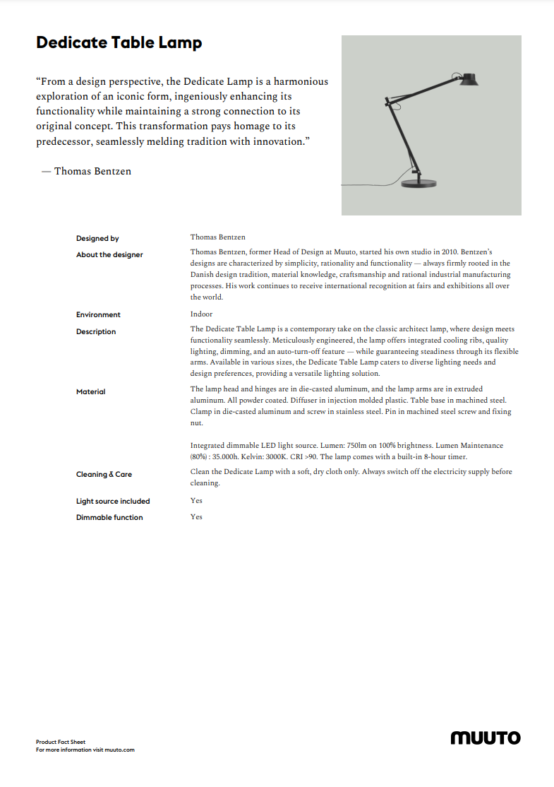Als ehemaliger Head of Design von Muuto hat Designer Thomas Bentzen seine ganze Expertise genutzt, um die Dedicate Tisch- und Wandleuchte in einem langwierigen Optimierungsverfahren zu perfektionieren. Dabei ist die klassische Architektenleuchte eigentlich eine tradierte Idee, die Benutzen komplett neu denkt. Mit moderner Technologie und ausgeklügelten Mechanismen verleiht er der Leuchte einen zeitgenössischen Look, der sowohl als Wand- oder Tischleuchte, mit Fuß oder Klemme an jedem Schreibtisch glänzt.