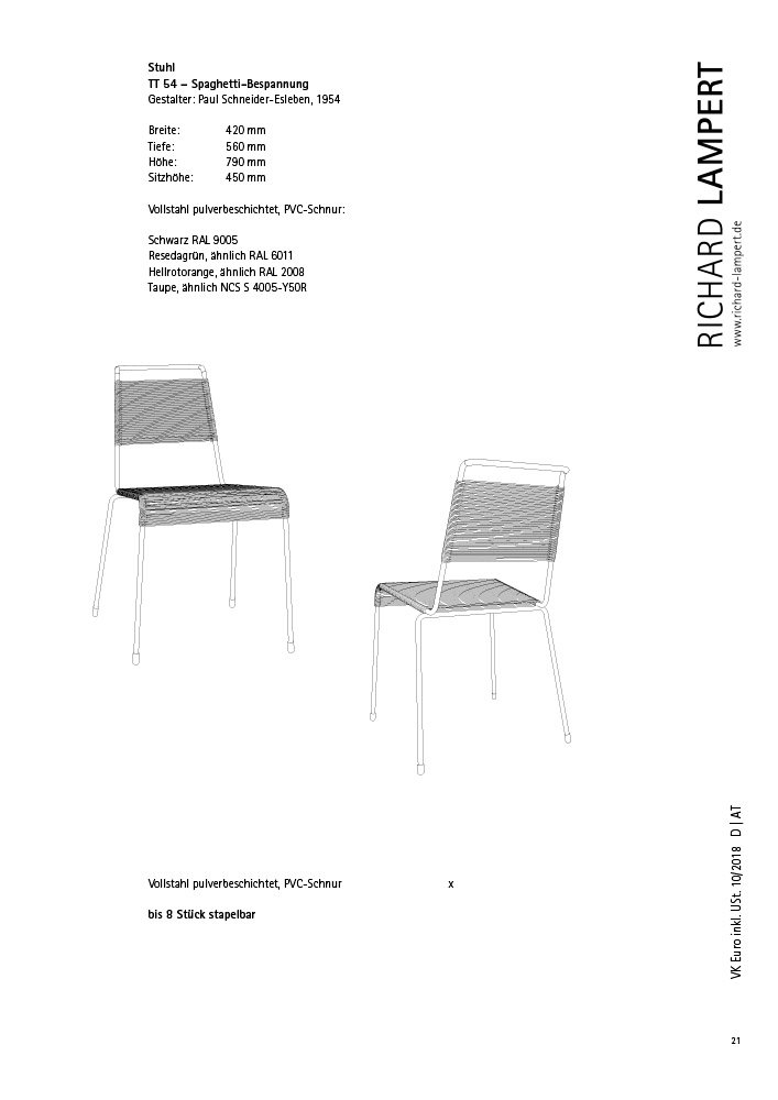 Der TT54 Stuhl, auch Spaghetti-Stuhl gennant, geht auf Paul Schneider-Eslebens Entwurf aus dem Jahr 1954 zurück und wird heute vom Stuttgarter Hersteller Richard Lampert produziert. Der Klassiker mit Sitz und Rückenlehne aus PVC-Schnüren eignet sich sowohl für den Einsatz im Innenbereich als auch im Außenbereich perfekt. Das macht den pflegeleichten TT54 zum praktischen Allzweckstuhl, der sich bei Bedarf sogar noch stapeln lässt - die spontane Gartenparty kann steigen!