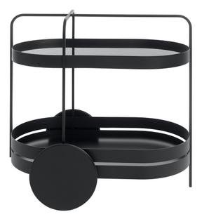 | Material | Korpus: Stahl, pulverbeschichtet Obere Ablage: Klarglas, unterseitig lackiert Untere Ablage, Räder: MDF, lackiert |