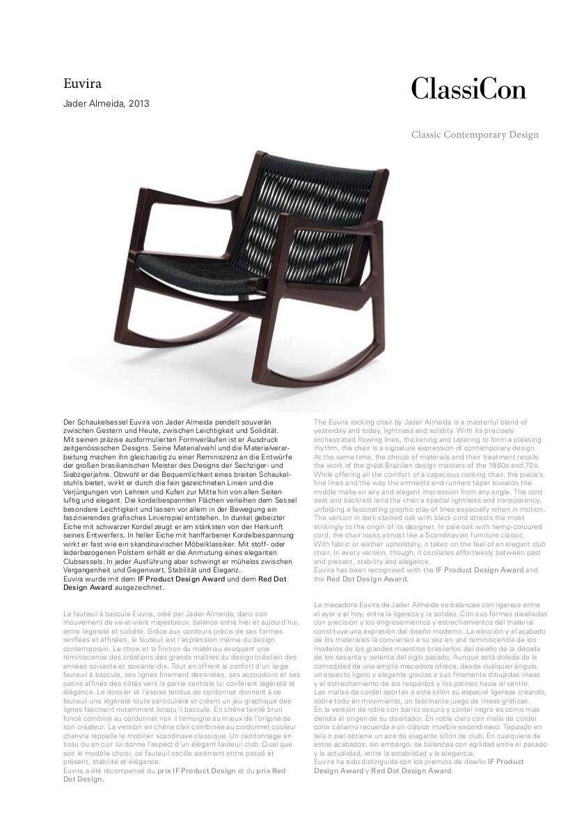 Dass der Designer von Euvira Schaukelstuhl ein Brasilianer ist, lässt das Erscheinungsbild des schönen ClassiCon Schaukelstuhls nicht sofort vermuten, denn in seiner Ausführung aus natürlichem Eichenholz und hanffarbener Sitzkordel hätte sich Jader Almeida genauso gut traditioneller skandinavischer Herstellungskunst bedienen können. Der Euvira Schaukelstuhl wirkt, als würde er zwischen Leichtigkeit und solider Standhaftigkeit pendeln, der Rahmen macht ihn zu einem stabilen Sitzmöbel und die durchscheinende Sitzfläche aus Kordel fügt dem Ganzen eine Prise Transparenz hinzu. In verschiedenen Beizungen und Lackierungen und mit hellen oder dunklen Kordeln passt Euvira von ClassiCon in nahezu jedes Farb- und Raumkonzept und lädt überall zum Entspannen und Träumen ein.