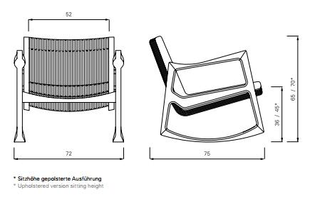 | Abmessungen | ![]() Höhe: 65 cm Breite: 72 cm Tiefe: 75 cm Sitzhöhe: 36 cm |