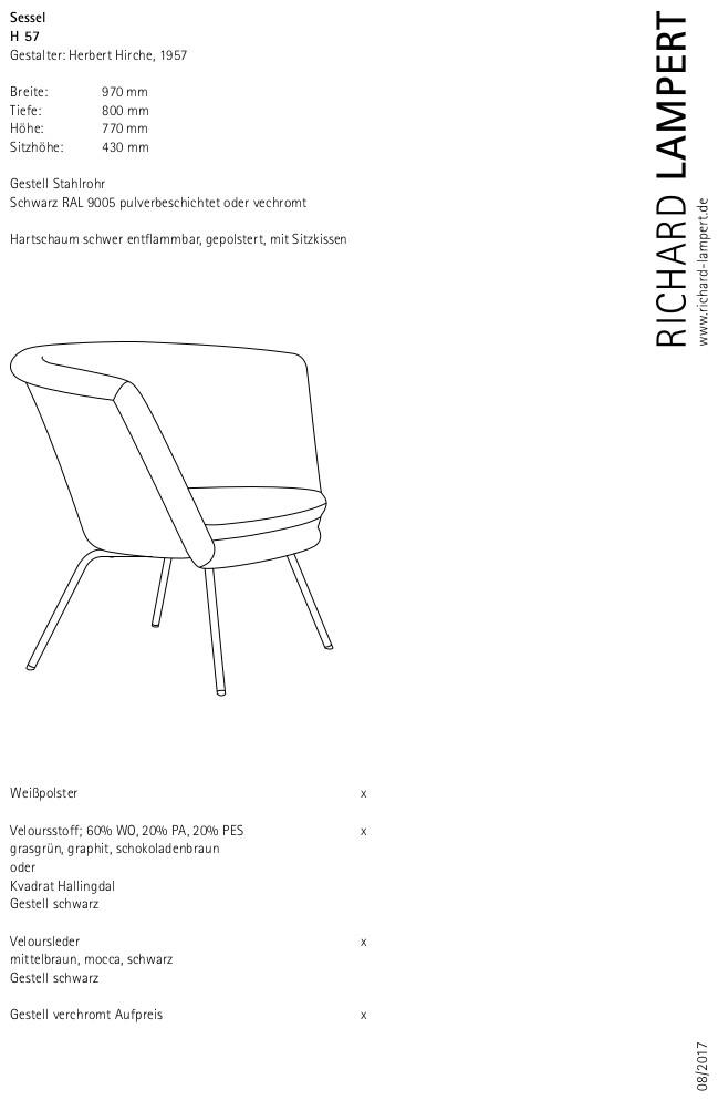Der H57 Sessel des Stuttgarter Herstellers Richard Lampert basiert auf einem Prototypen von Herbert Hirche, den dieser für die Ausstellung "Interbau 1956" in Berlin entworfen hatte. Wiederentdeckt wurde der Sessel 2010 anlässlich des 100. Geburtstags Herbert Hirches. Mit seiner vom Metalluntergestell getrennten Sitzschale erinnert der H57 Sessel an die Entwürfe von Eero Saarinen und Charles & Ray Eames, weist aber trotzdem seinen ganz eigenen Charakter auf.